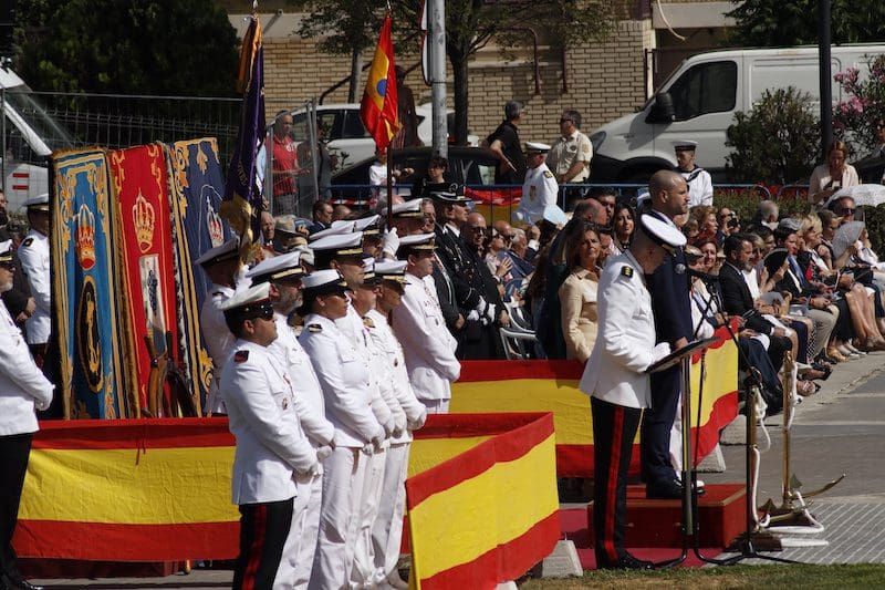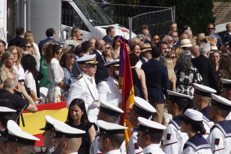 J. BACHILLER/J. MARUGÁN (fotos). El acto de la primera Jura de Bandera destinada a la sociedad civil que tuvo lugar en el Parque de Colón de Majadahonda se realizó como se venía anunciando este sábado 18 de junio (2022), organizado por la Armada y promovido por el Ayuntamiento. Para su celebración, se valló el ruedo que perimetra este parque, teniendo tan solo acceso las autoridades, los jurandos y los asistentes invitados, que aunque sentados, tuvieron que soportar las elevadas temperaturas del día. Aunque escaso, más beneficiado por la sombra bajo los árboles que rodean el lugar fue el público que se acercó a visualizar el evento. Según asegura el consistorio en su escueta nota de prensa enviada a los medios de comunicación, casi 200 personas fueron los solicitantes que realizaron el juramento a la enseña nacional, los cuales desde las 9:00 horas se encontraban en el lugar para recibir instrucciones del protocolo del acto. Y en similar cantidad, acudieron los invitados, como podía comprobarse por el número de sillas destinadas para su ubicación. Como bien apuntó en su discurso durante el acto el Almirante Jefe de Servicios Generales y Asistencia Técnica de la Armada, Rafael Fernández-Pintado Muñoz–Rojas, hombres y mujeres de diferentes edades, desde jóvenes a mayores fueron los que solicitaron participar en esta Jura de Bandera.