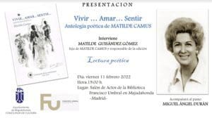 J. FEDERICO MTNEZ. La «Antología Poética» de Matilde Camus, poeta e investigadora nacida en Santander, se presenta este viernes 11 de febrero (2022) a las 19:00 horas en el Salón de Actos de la Biblioteca Municipal Francisco Umbral de Majadahonda. La presentación de este recital de poesía corre a cargo de su hija Matilde Guisández y el libro fue editado por el Gobierno de Cantabria en el centenario del nacimiento de la poeta e investigadora cántabra. Su hija, Matilde Guisández, editora de contenidos de la Antología, pondrá su voz haciendo un recorrido por la vida y obra de la poeta. Recitando algunos de sus poemas más significativos, estará acompañada al piano por Miguel Ángel Durán. El libro se encuentra a disposición de todos los que deseen conocer más a esta escritora en la web www.matilde camus.com.
