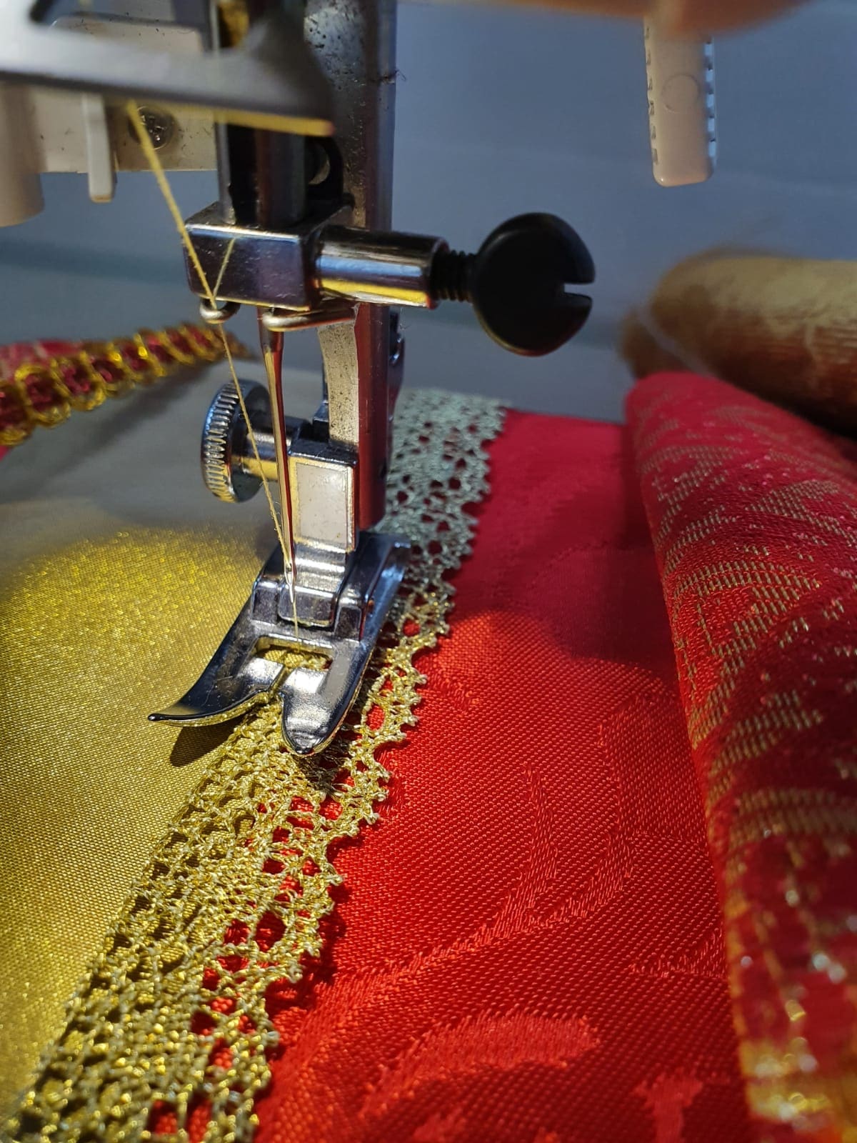 JULIA BACHILLER. Con motivo de la fiesta de Pentecostés de 2021, la parroquia de Santa Catalina Mártir ha engalanado para la ocasión a dos de sus imágenes más veneradas, Nuestra Señora de la Soledad y Santa María Inmaculada de la Alegría. La Festividad se celebra 50 días después de la Pascua y con ella los cristianos festejan la Venida del Espíritu Santo, el cual viene representado por el color rojo. El acto finalizará con una solemne misa el Domingo de Pentecostés, segundo domingo más importante del año, donde los cristianos viven la relación existente entre la Resurrección de Cristo, su Ascensión y la venida del Espíritu Santo. En esta ocasión las dos imágenes han tenido un “camarero”excepcional: David de Calle, el joven diseñador majariego, que en el día de su cumpleaños, este jueves 20 de mayo (24 años), hizo gala de su maestría. Junto al párroco y manteniendo una línea acorde con el respeto y sobriedad que requiere esta labor, ambos realizaron la delicada y laboriosa función que conlleva este cambio de vestuario.Sobre la saya confeccionada por Ana Montero, profesora de corte y confección en el Club Reina Sofía de Majadahonda, el diseñador majariego completó la indumentaria que hoy luce la Virgen de la Alegría.