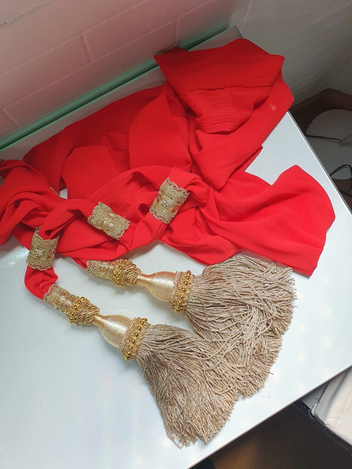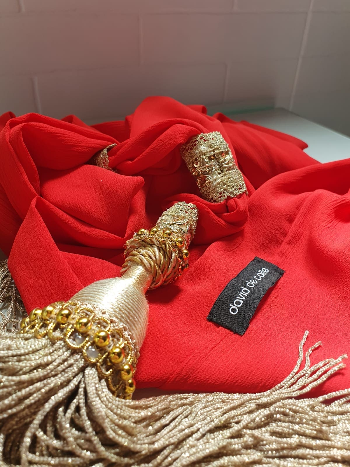 Tomando como base el color rojo, símbolo de esta festividad, David de Calle ha confeccionado un enorme manto que resalta el contorno de la imagen. En la parte superior, bajo la corona, una mantilla de similar color delimita la parte superior del torso, sobre el cual las bandas plegadas de color canela alrededor de la cara confieren una tonalidad que hace resaltar la belleza y sencillez que trasmite la figura. Destacar el fajín en tonos dorados y con gamas de color rojo como otra pieza clave de la vestimenta, con distintas texturas de tejidos y adornado con pasamanería. Acorde con su madre, el niño que lleva en los brazos luce otro de similares características.Tanto el Manto de Damasco, la mantilla de encaje y los fajines de gala brocados para la Virgen y el niño, como el fajín militar brocado junto con una medalla de la Virgen del Rocío, que luce la Virgen de la Soledad, han sido donados por la familia Cañete-Acosta-Lastra, a la cual pertenece el diseñador. Y ambas resaltan su indumentaria con sus coronas y joyas, que en numerosas ocasiones son regalos de los vecinos. Así lo hace el broche que destaca sobre el fajín de la Virgen de la Alegría, aportado por el modisto. Y sobre una gran estrella dorada la figura de una paloma blanca, símboloque representa al Espíritu Santo. Hasta el próximo 6 de junio, fecha en que se celebra el Corpus Christi, (ya que este al caer en jueves 3 de junio se traslada al domingo), las imágenes lucirán estas galas para todos aquellos que quieran acudir a verlas.