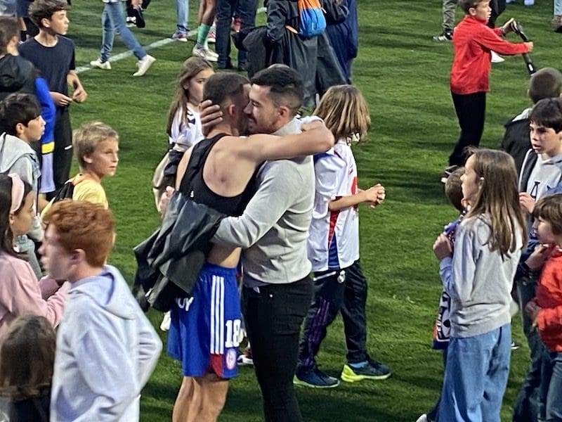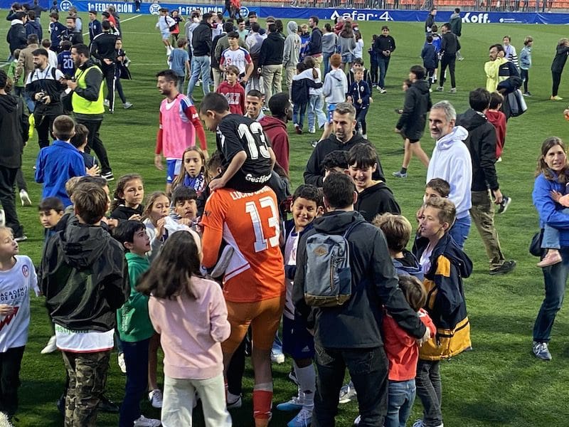 FEDERICO MTNEZ. La extraordinaria segunda parte del Rayo Majadahonda este sábado 27 de mayo (2023) en el Cerro del Espino frente al Mérida, contemporizando, aguantando el empate (1-1) y apuntalando el resultado que le daba la permanencia frente al difícil Mérida, fue la clave de su permanencia en Primera RFEF. Y es que el equipo majariego fue mucho mejor que en la primera mitad. Más tranquilo por el resultado, entregándose en cada balón en disputa y guardándose los nervios en los bolsillos, el equipo local jugaba con mayor habilidad, realizaba diagonales imposibles, buscaba los espacios y ganaba un tiempo precioso para mantener con el empate en el marcador esa ansiada permanencia. Y con ese oficio de los veteranos y grandes jugadores junto a la savia nueva de los jóvenes, unos acertados cambios y una mejor impresión sobre el cesped, logró el objetivo tantas veces acariciado. Con el pitido final llegó la invasión del campo y centenares de chavales, padres, madres y aficionados saltaron a abrazar a los Lucho, Casado, Néstor, Pelayo, Mario, Zozulia, Rubi o Félix Ofoli, que se dejaron la piel en el campo y fueron protagonistas de un encuentro que ni ellos ni Majadahonda olvidarán jamás. El «partidazo» dejó unas imágenes de alegría desbordante que quedarán para siempre en el recuerdo de un club, de una ciudad y de la Historia de todos aquellos que lo vivieron y lo disfrutaron.