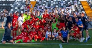Foto del Rayo Majadahonda tras el partido de Badajoz donde alcanzaron la gloria en el último segundo del último minuto de la Liga. Ahora toca lo más difícil: consolidarlo en 1 partido contra el Albacete para llegar a la final