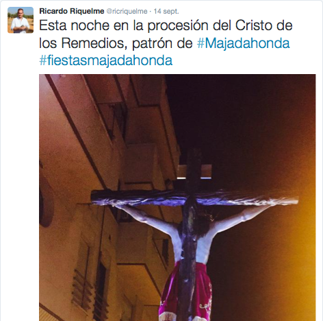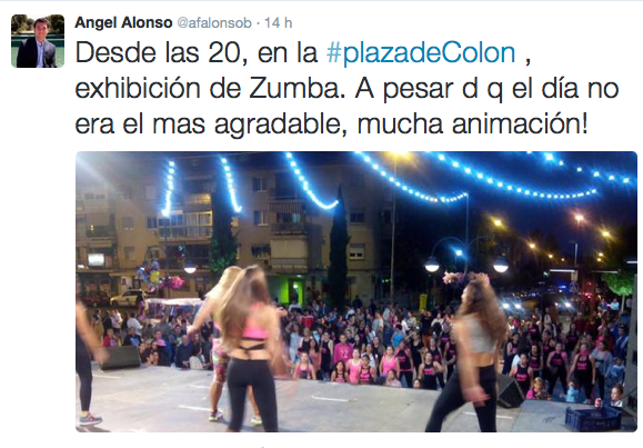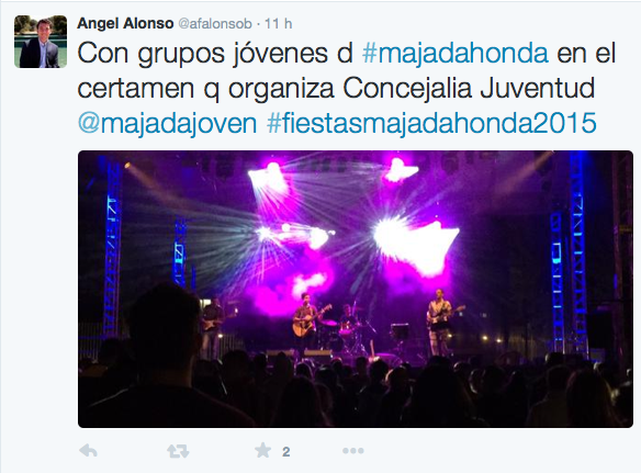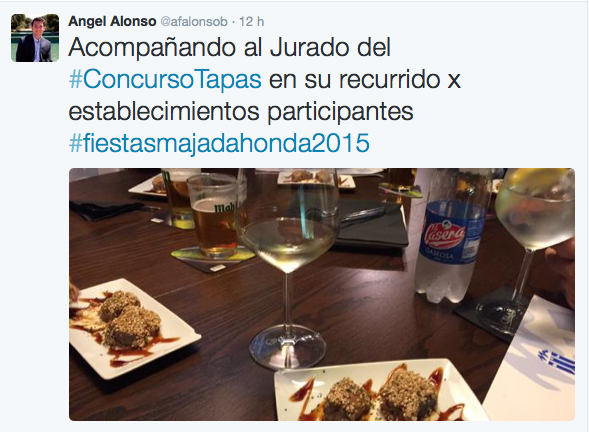 Pero quizás el concejal del PP más dinámico en estas fiestas sea Angel Alonso, responsable de Hacienda y Festejos. Los 290.000 euros que han costado casi se lo exigen. El concierto de los jóvenes grupos musicales, el concurso de tapas, la exhibición de zumba, el recital de tunas, la Misa Mayor, la “ciencia divertida” para los pequeños, el día de la bici, el pregón, el campeonato de mus, la feria del gourmet… Difícil encontrar un acto donde no haya dejado anotada su presencia. El concejal Ricardo Riquelme le va a la zaga: se le vio el “dia de la bici” y en las celebraciones religiosas. A la concejala Victoria Palacios en el Mercado de la Tierra del Zoco y Manuel Ortiz, que cambió su portavocía en Getafe por la tenencia de alcaldía en Majadahonda, retuitea a Nuevas Generaciones cuando se hace eco de las celebraciones religiosas o de las actividades de su amiga y compañera Victoria Palacios.