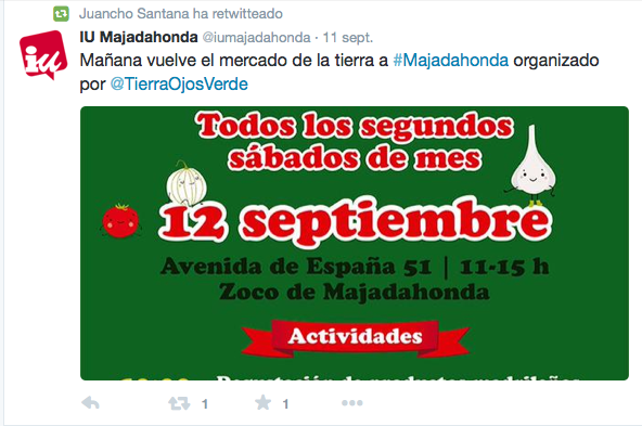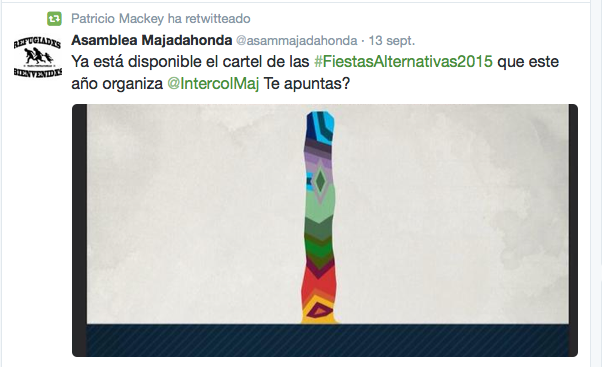 Entre los socialistas ocurre lo mismo. Por las fiestas se ha visto ocasionalmente al portavoz, Zacarías Martínez, y al secretario general, Javier Vales, pero han sido las concejalas Elisa Piñana y Socorro Montesdeoca las que se han dejado ver en las redes sociales por el concurso de tapas o por la Despensa Solidaria. En este sentido, tanto Somos Majadahonda como Izquierda Unida han preferido retuitear los actos no oficiales: Patricio Mackey se ha hecho eco del cartel de las “Fiestas Alternativas 2015” organizadas por Intercolectivos Majadahonda, plataforma que aglutina diferentes colectivos y movimientos sociales y que recoge el testigo de la Asamblea de Majadahonda.