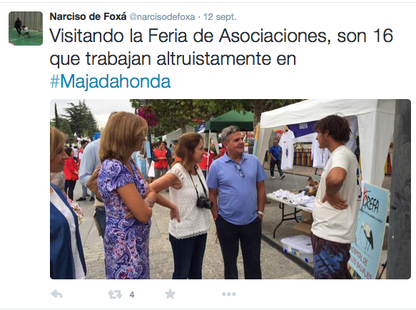 Un repaso a las redes sociales permite conocer cual es la actividad de los concejales del Ayuntamiento de Majadahonda en las fiestas de la ciudad. El alcalde, Narciso de Foxá, se muestra muy activo: desde la tradicional llegada a la ermita del Cristo de los Remedios y el no menos habitual pregón, hasta la Feria de Asociaciones o acompañando al equipo majariego de Football Americano “Wildcats”: “Tenemos preparados 14.000 botellas y 5.000 vasos de plástico para mayor seguridad en Fiestas en recinto ferial”, llegó a twitear el primer edil, que animó también a la participación en la “Fiesta de la Bici”.