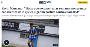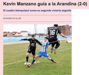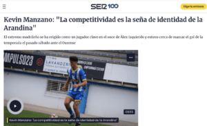 KEVIN MANZANO: ANÁLISIS DE JORGE ALVARADO EN RADIO ARANDA (CADENA SER): «La competitividad es su seña de identidad: el extremo madrileño se ha erigido como un jugador clave en el once de Álex Izquierdo y estuvo cerca de marcar el gol de la temporada ante el Ourense. Kevin Manzano fue el primero en sumarse al barco de la Arandina. Se convertía en el primer fichaje del club, más allá de las muchas renovaciones anunciadas, para el nuevo reto de la institución en Segunda RFEF. Proveniente de Las Rozas, se esperaba fuera un jugador diferencial que pudiera aportar mordiente al ataque blanquiazul y no defraudó. Porque además de contar con minutos, Kevin Manzano mostró el descaro propio que ha de tener un jugador en su posición y, de hecho, estuvo a punto de lograr un auténtico golazo en el duelo frente al Ourense. «Es una jugada que hago bastante, dio al palo y mala suerte. Pero son cosas que tiene el fútbol. Intentaré más, a ver si entra la siguiente», reconocía el jugador, valorando que a veces «falta el gol» pero afortunadamente «no por falta de ocasiones», y más aún «ante un equipo tan complicado que lleva mucho sin perder».