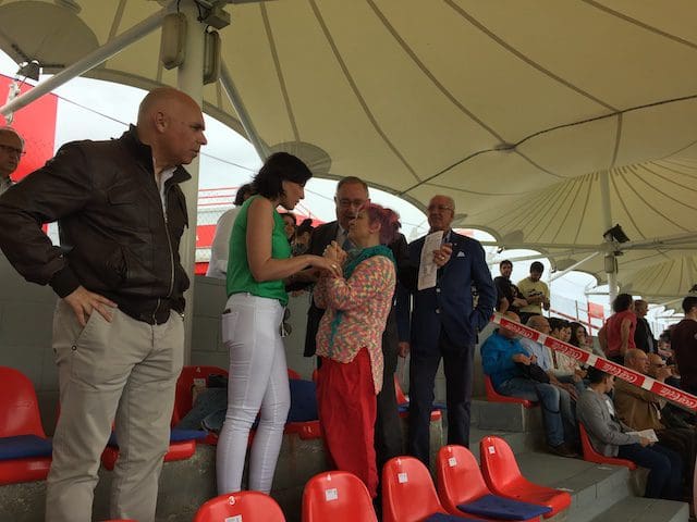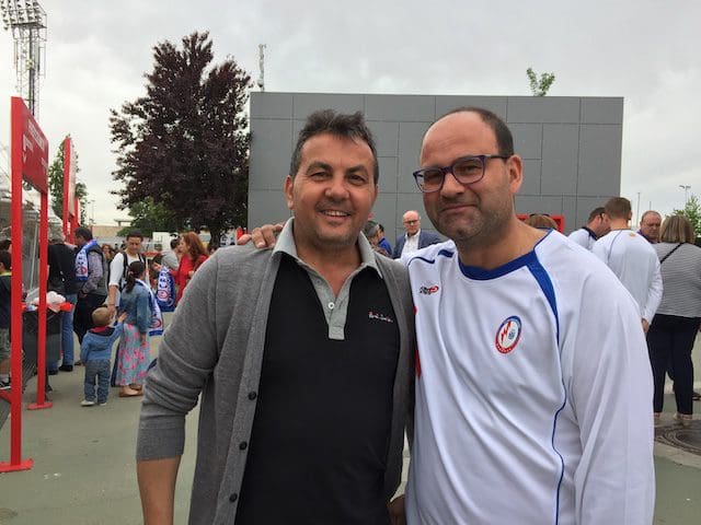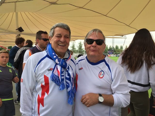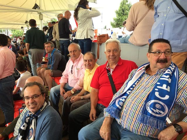 El cronista deportivo J. Federico Mtnez en la grada del Cerro con un mítico seguidor cántabro (que falleció durante la pandemia) en el partido Rayo Majadahonda-Racing de Santander (2017)
