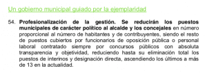 La medida nº 28 prometía la «eliminación de los coches oficiales. Los desplazamientos podrán hacerse con los taxis con licencia de la zona», sin embargo sigue habiendo un coche oficial en el que se desplaza el alcalde. «No queremos enchufados, VOX se compromete a que con carácter general, los puestos de trabajo sean desempeñados por personal funcionario o personal laboral. Por ello se procederá a la eliminación del personal de confianza de libre designación. Se contratará por concurso de méritos«, decía la medida nº 49. Sin embargo, el militante Federico Fernández de la Puente Isusi ya representa al Grupo Municipal como responsable de prensa. Y además posee otra jefa de prensa compartida con el PP para promocionar las labores del pacto de Gobierno, aunque se había comprometido también durante la campaña electoral a la «neutralidad institucional».