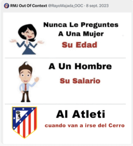 MANU RAMOS. Hasta la redacción de MJD Magazin han llegado este año que acaba de concluir numerosos «memes», viñetas y chistes que los lectores han trasladado desde las redes sociales y por ellos hemos seleccionado este mes de enero de 2024 algunos de los que nos han parecido más ingeniosos. Para justificar su publicación, el editor de la revista «Soy de Madrid», Esteban Hernando, que ya protagonizó una doble entrevista en MJD Magazin, explicó el año anterior en su artículo «Un año marcado por la sátira», que «como repaso al mundo local, que es nuestra especialidad, podemos decir que ha sido un año interesante, hemos podido seguir de cerca muchas de las cuestiones que en cada municipio han marcado polémica, incluso lo que otros medios menos críticos con el poder han intentado ocultar o pasar de soslayo. Hemos podido y en muchos casos logrado, trasmitirlo con un tono de humor y sátira que ya hemos consolidado como método eficaz de llegar a todos vosotros». Y por ello resume este tono de ironía, que hacemos nuestro, con estas palabras: «Al final un medio de comunicación no es mas que esto, un medio para tener acceso a vuestra inteligencia, que, si bien es cierto, muchos no la quieren usar, somos otros muchos los que cada vez somos mas conscientes de nuestra responsabilidad y relevancia como mentes criticas y constructivas de la próxima sociedad que se avecina».