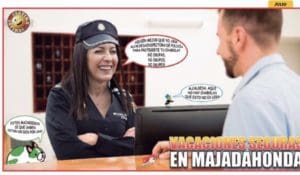 “Vacaciones seguras en Majadahonda”: ¿quien mejor que yo una alcaldesa inspectora de policía para protegerte tu chabola?, dice la primera edil, a lo que Pepito Grillo responde: “alcaldesa, que aquí no hay chabolas, que esto no es Lega”, en alusión a su residencia en el municipio del Sur de Madrid