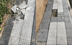 Bizarro, chocante, demencial y peligroso me parece el estado de la acera de la calle Benavente: Y es que esas losas levantadas, desde hace tiempo, son algo feísimo pero –además- sumamente peligroso.