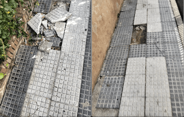 Bizarro, chocante, demencial y peligroso me parece el estado de la acera de la calle Benavente: Y es que esas losas levantadas, desde hace tiempo, son algo feísimo pero –además- sumamente peligroso.