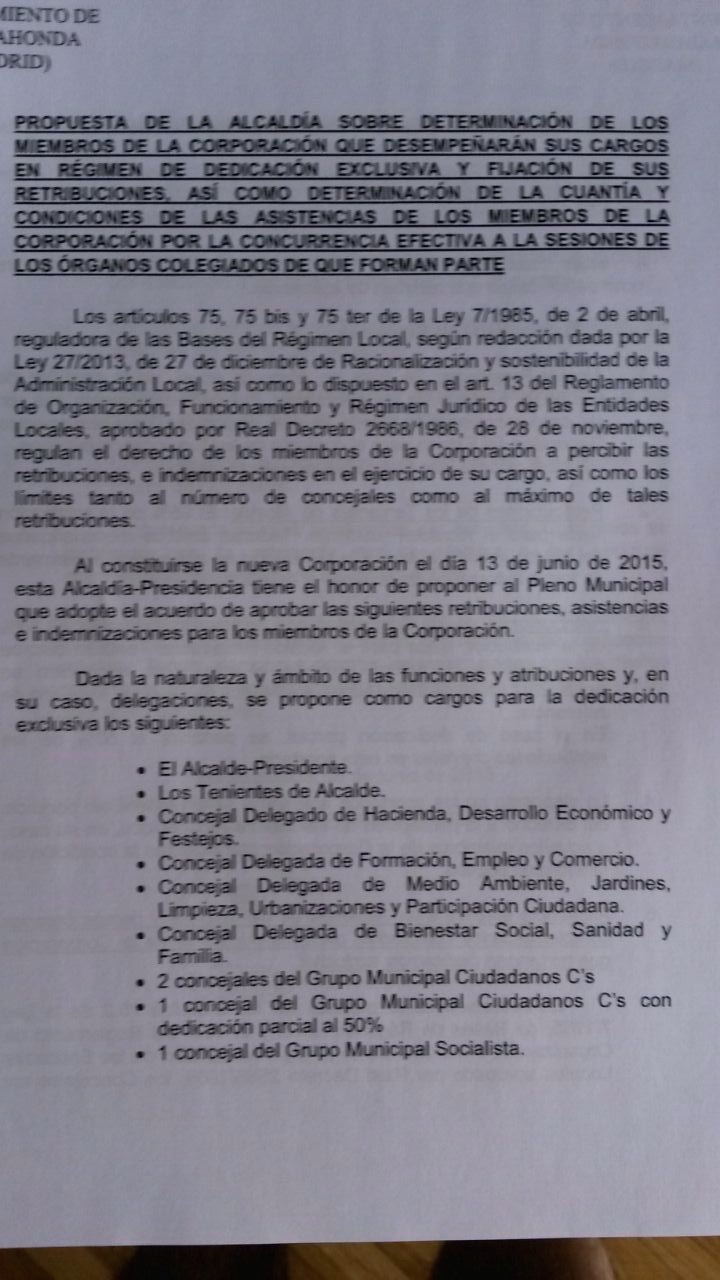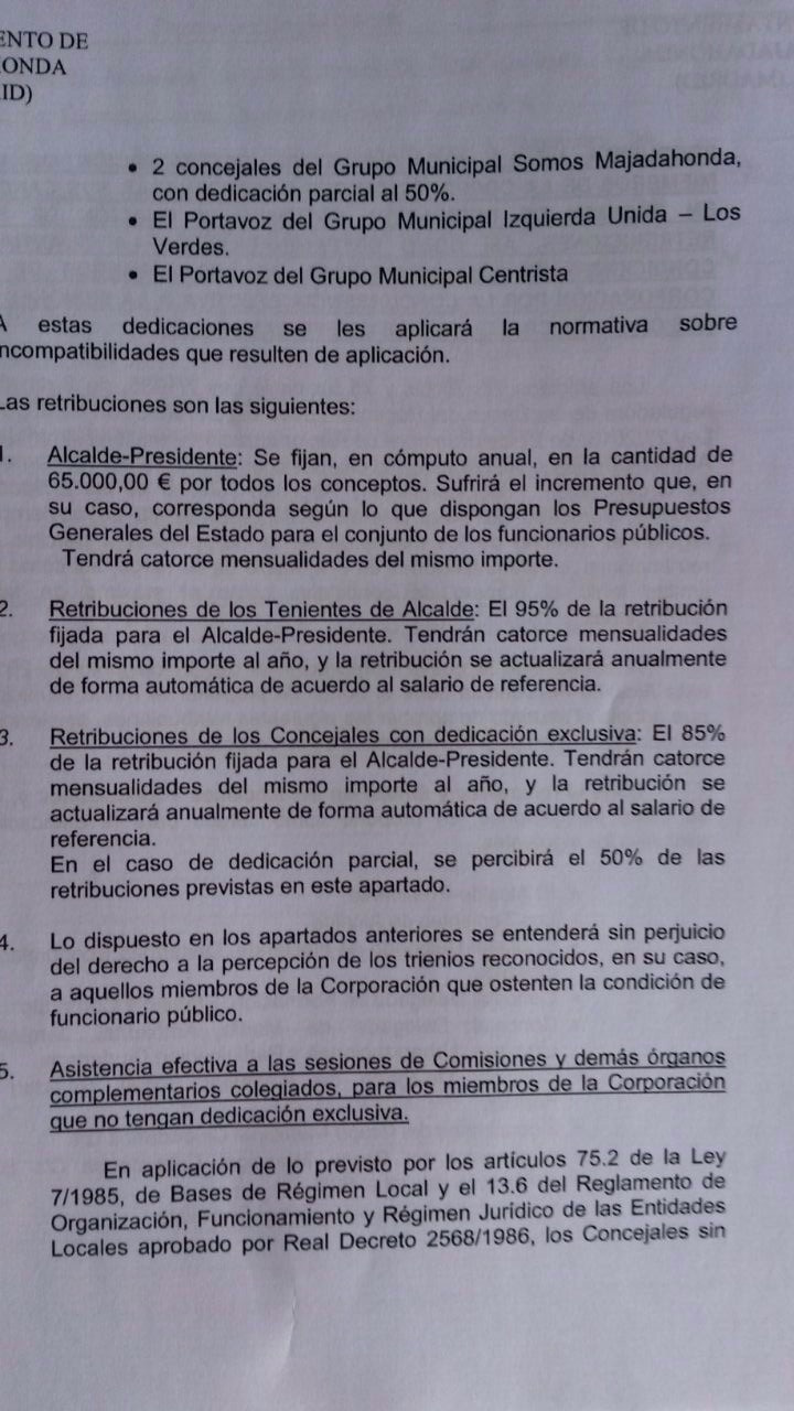 Además, todos los ediles no cobrarán dietas o sueldos y han tenido que elegir uno de los dos ingresos, según vaya a ser su dedicación y los límites de la «ley Montoro» (máximo 15 dedicaciones exclusivas para Majadahonda). Incluso Ciudadanos ha devuelto 27.000 euros anuales al Ayuntamiento. También se ha reducido el número de concejales de las comisiones, con lo cual disminuyen las dietas, y otra novedad es que en ellas posee mayoría la oposición.