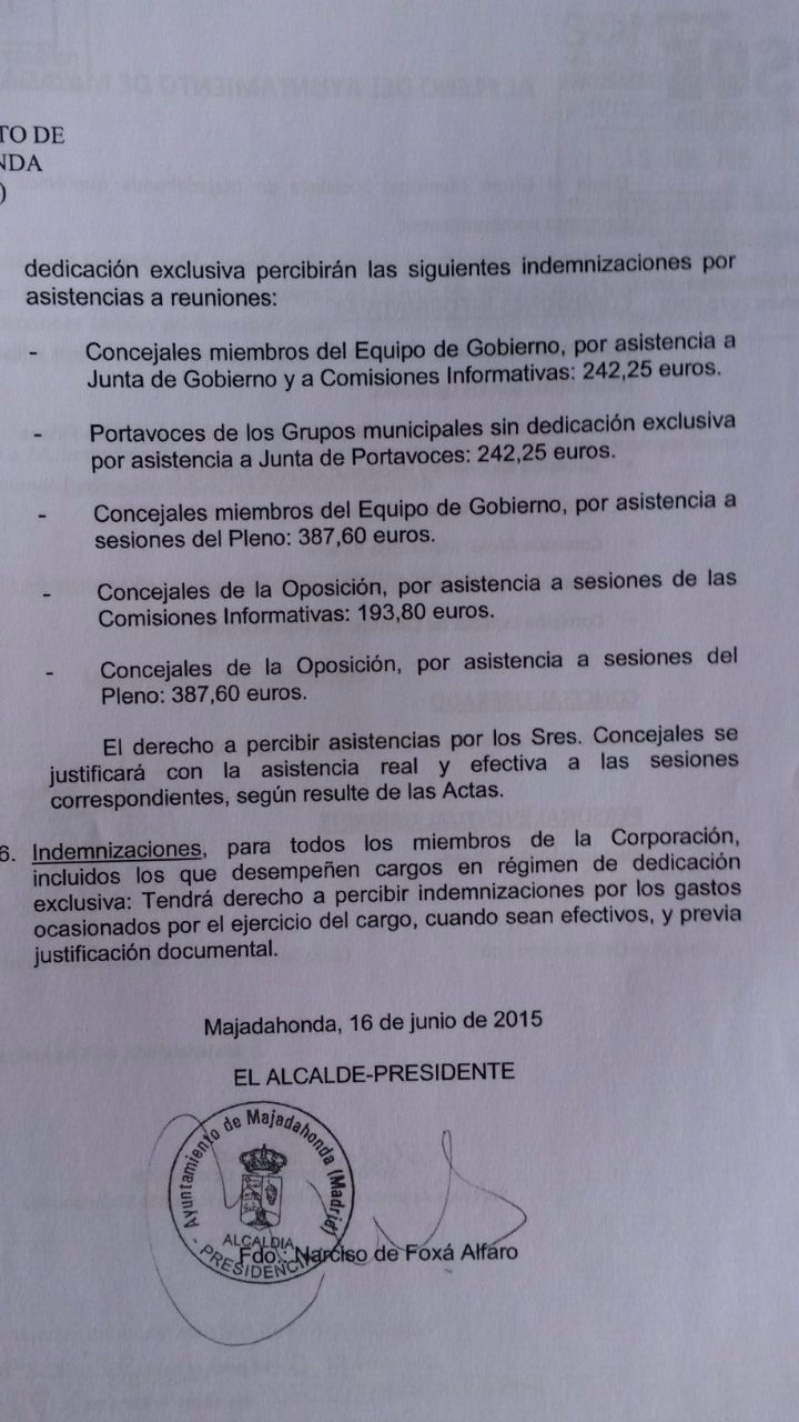 Mientras los vecinos se imaginan que tanta opacidad obedece a prácticas espúreas, MJD Magazin ha tenido acceso a los documentos que recogen los sueldos y dietas que perciben el alcalde y los concejales del Ayuntamiento de Majadahonda durante esta legislatura que acaba de comenzar. Y ha descubierto que el alcalde, Narciso de Foxá, se ha bajado el sueldo desde los anteriores 73.500 euros a 65.000 (-8.500 euros) y como el resto de salarios se bareman en porcentaje al sueldo del alcalde, automáticamente bajan todos (tenientes alcalde (-8.000), concejales (-5.000).