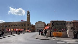 Pero la cosa es que hay mucha más Pisa que la del “Campo dei Miracoli”, donde se halla la torre. Que se trata de abandonar esa zona, donde los turistas afanados en hacer como que atrapan con manos y pies el declive marmóreo (debido a las aguas subterráneas en el suelo pisano) para dirigirnos a las ciudad de Pisa. Todo un recuerdo medieval digno de un marco. Cuando Pisa, bañada por el mismo río de Florencia, el Arno, por lo tanto, rivalizaba con la capital del ducado de Toscana, en riqueza y virtudes. De hecho ambas ciudades lucharon con intensidad. Cual lo hizo Florencia, tan peleona, también con Siena. De hecho hasta 1406, integración de Pisa en el dominio florentino, la ciudad pisana, y su ámbito, con poderío marítimo (hoy existe todavía la llamada “marina” de Pisa) había convertido en su sombra el caudal mercantil y bancario de Florencia. Pasear hoy por la parte menos conocida de Pisa es un lujo: edificios nobles, tenderetes callejeros de todo tipo, fruta, legumbres, libros, también, y -por supuesto- un “Lungarno” como el de Florencia, un paseo a lo largo del Arno, prodigioso. Pisa, tan bellamente desconocida.