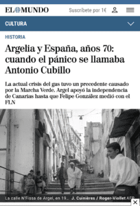 «El trabajo de Cubillo entró así en la agenda de los problemas del último franquismo. Sobre todo, a raíz de la Marcha Verde, de la toma de los territorios españoles del Sáhara Occidental por una masa de civiles marroquíes. En ese momento, Argelia consideró que la manera en que España se resignó a esa derrota fue una concesión a Marruecos que rompía el equilibrio entre los tres países. Su forma de castigar a España consistió en potenciar la figura de Antonio Cubillo. En abril de ese año, agentes de la seguridad del Estado encubiertos apuñalaron a Cubillo en la escalera de su casa en Argel. Es el único crimen de Estado así calificado por una sentencia judicial española. El abogado tinerfeño sobrevivió herido para siempre pero ya no pudo superar su marginalidad en la política canaria. Partidos nacionalistas no violentos como Unión del Pueblo Canario ocuparon su espacio. Y España y Argelia, mientras, vivieron 44 años de relativa estabilidad. Hasta ahora». Y Luis Alemany concluye: «¿Algo más?. Sí: en 2016, el exministro José Manuel Otero Novas dijo en una entrevista en La Opinión de La Coruña que la CIA presionó a España para que entrara en la OTAN con la amenaza de que, de lo contrario, jugaría la carta de Cubillo en su contra. No aportó documentos que lo avalaran».