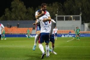 Celebración de los dos goleadores (Cortés y Arnedo) en el Rayo Majadahonda – Arenteiro (2-0), correspondiente al partido de la primera vuelta en el Cerro del Espino