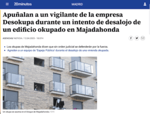 MANU RAMOS. Toda la prensa nacional recoge los sucesos ocurridos este miércoles 12 de abril (2023) en Majadahonda en lo que ha sido el primer enfrentamiento abierto entre “Okupas” y “Desokupas” por el desalojo de un edificio en la calle Doctor Ciriaco García García número 6. La novedad es que la empresa “Desokupa” ha advertido que este jueves volverá al edificio y ha interpuesto una denuncia por agresiones, mientras que los “okupas” aseguran que los “desokupas” utilizaron “gas pimienta” y barras “extensibles” para golpearles, algo que desmiente la empresa en un comunicado. El edificio está okupado por 30 personas, entre ellos 2 menores de edad. En este operativo intervinieron una treintena de agentes de la Guardia Civil, Policía Local e integrantes de la empresa. Según cuentan los okupas, hace unos meses las personas que viven ahí pagaron 7.000 euros cada uno al dueño del edificio, que hasta entonces vivía en el piso inferior, para que les abriera la puerta de las casas y viven ahí desde entonces «con luz, agua y cuidando el edificio». Daniel Esteve (Desokupa) declaró: «Una vez desalojados esos pisos, los okupas han acudido con armas blancas y sobre las 06.45 nos han atacado. Nosotros hemos minimizado el ataque y en ese enfrentamiento uno de los vigilantes ha resultado apuñalado». Y ha anunciado que van a pedir en el juzgado de Majadahonda el desalojo judicial del edificio.