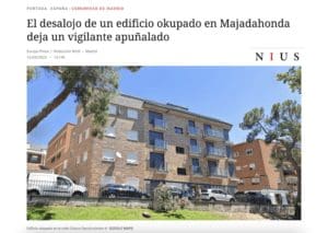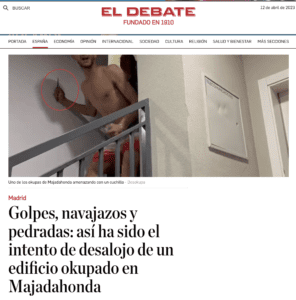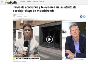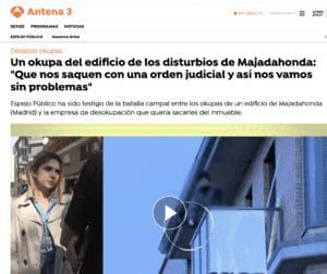 ANTENA 3: “Espejo Público ha sido testigo del enfrentamiento entre un grupo de vecinos okupas de Majadahonda (Madrid) y la empresa de desokupación que ha intentado sacarles del edificio. Este miércoles llegaba a la calle Doctor Ciriaco García García número 6 una empresa de desokupación. Al principio parecía que todo se iba a resolver de manera pacífica pero de un momento a otro ha comenzado una trifulca. Vanessa Pámpano, reportera de Espejo Público, reconoce que la tensión se cortaba en el ambiente entre los reporteros que han acudido a la zona. En la azotea del edificio un encapuchado ha estado amenazando a los reporteros con un cuchillo de grandes dimensiones porque no quiere que le graben el rostro».
