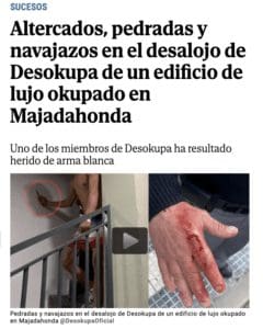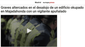 ANTENA 3 (Ángela Clemente): “Suceso con graves altercados y un vigilante de seguridad apuñalado en Majadahonda. Ha ocurrido durante el desalojo de un edificio de lujo de once plantas okupado. El propietario del edificio de la calle Ciriaco García número 6 contrató a la empresa ‘Desokupa’ con la intención de recuperar el inmueble. Allí residen de manera ilegal una veintena de magrebíes. Compañeros de Espejo Público que se encontraban trabajando en la zona han sido agredidos por los okupas. Ha sido sobre las 6:50 horas cuando ha comenzado el desalojo, produciéndose momentos de gran tensión por altercados entre los okupas, agentes de la Guardia Civil e integrantes de ‘Desokupa’. Los okupas se han enfrentado con machetes y piedras contra todos los que trataban de acceder al edificio. Entre tanto, un vigilante de control de acceso ha sido apuñalado en la mano, necesitando asistencia sanitaria. Los okupas también han lanzado objetos contra los periodistas, entre los que se encuentran un equipo de Espejo Público, que estaban allí cubriendo el suceso. Entre otros objetos que les han lanzado, un mueble y una televisión. La empresa ha recuperado tres plantas del edificio y este jueves solicitará una medida cautelar de desalojo inmediato al juzgado aportando pruebas de que hay una banda organizada de delincuencia habitando el inmueble. «Confiamos en que con todo lo sucedido esta mañana con las agresiones, las pedradas y el apuñalamiento en 48 horas habrá un desalojo», ha confiado Daniel Esteve, responsable y fundador de ‘Desokupa’ a Europa Press.