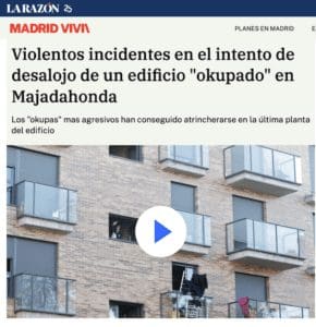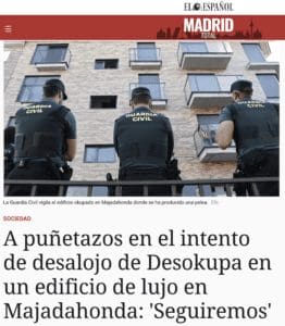 LA RAZON. “El intento de desalojo de un edificio de viviendas «okupado» en la localidad madrileña de Majadahonda ha provocado incidentes entre los miembros de la empresa privada que acudió a desocupar el inmueble y varias de las personas que lo ocuparon, lo que ha obligado a acudir a agentes de la Guardia Civil y de la Policía Local. El intento de desalojo del edificio de viviendas se ha producido a primera hora de la mañana, cuando miembros de la empresa Desokupa han acudido para intentar sacar a las personas que viven en él, y éstos se les han enfrentado con actitud violenta. Según las imágenes que ha emitido Telemadrid, varias personas se han enfrentado a los miembros de la empresa Desokupa, han intentado agredirles a golpes y han arrojado objetos contra ellos. Fuentes de la Guardia Civil han confirmado que han tenido que enviar al lugar a una decena de patrullas, que han colaborado con la Policía Local.