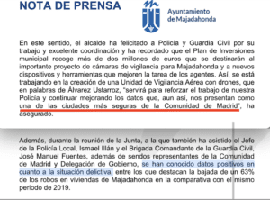 Con estos datos, y dado que el informe se dio a conocer al alcalde de Majadahonda y a su concejal de Seguridad, Angel Alonso (PP-Vox), en la reunión de la Junta de Seguridad que tuvo lugar el 2 de septiembre (2021), causa extrañeza como el primer declaró que «se han conocido datos positivos en cuanto a la situación delictiva, entre los que destacan la bajada de un 63% de los robos en viviendas de Majadahonda en la comparativa con el mismo periodo de 2019″ y añadió que «vamos a continuar mejorando los datos que, aun así, nos presentan como una de las ciudades más seguras de la Comunidad de Madrid”. La nota oficial precisaba que «Así, durante la Junta Local de Seguridad celebrada esta mañana y presidida por el alcalde, José Luis Álvarez Ustarroz, se ha informado del operativo gracias al que entre ambos cuerpos se desplegarán cerca de 50 patrullas que peinarán los principales parques y zonas potencialmente favorables para la aglomeración de jóvenes principalmente entre las 20:00 y las 4:00 horas. Los agentes incrementarán la presencia y también establecerán plantones o puntos fijos en las zonas más conflictivas además de controles de accesos y de drogas y alcohol, tal y como ha precisado durante la reunión el primer teniente de alcalde y concejal de Seguridad, Ángel Alonso«.