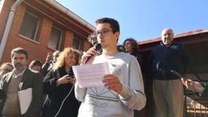 A continuación llegó la intervención de dos alumnos del Bachillerato de Ciencias del instituto, que representaban a todos los estudiantes, Eduardo Guerrero y Luis Solana. El primero comenzó diciendo: “Desgraciadamente ya no podremos decir más que Margarita Salas “es”: desde el día 7 de noviembre de 2019 en que supimos de su fallecimiento, apenados, no podemos más que decir: Margarita Salas “fue”. Y es por eso que hoy estamos aquí”. Seguidamente dio respuesta a una pregunta que él mismo planteó: “¿Quién fue Margarita Salas?”, detallando su vida y obra. Tras su exposición, otro alumno planteó otra cuestión: “¿Por qué nuestro instituto lleva su nombre?” Y respondió: “Margarita Salas ha sido y siempre será una representación del esfuerzo, el rigor, la constancia y el trabajo bien hecho”. Por último, finalizó diciendo: ”desde nuestro centro queremos manifestar nuestra profunda tristeza y agradecimiento por la estrecha colaboración y generosidad que tuvo con nosotros desde los inicios”, a lo que añadió: ”Os pedimos, os rogamos, a alumnos y profesores, que no la olvidéis, que no dejéis que la olviden, pues lo que nos ha regalado esta mujer no tiene precio y es lo menos que podemos hacer”.