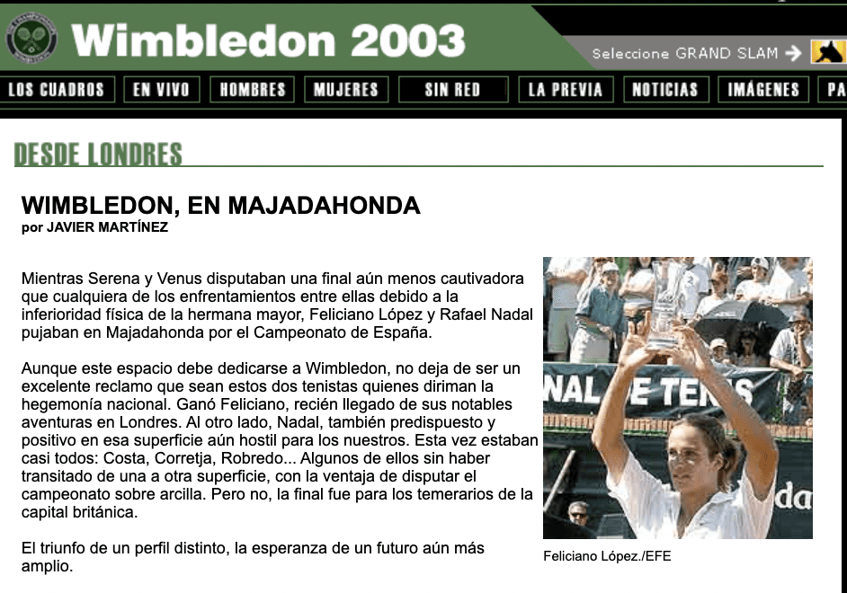 JUAN FEDERICO MARTINEZ (OPINION). Hace casi 20 años, concretamente un calurosísimo y casi infernal domingo 6 de julio de 2003, acudí al Club Internacional de Tenis de Majadahonda, un lugar que es referencia en toda España y que debería ser mucho más mimado y apoyado desde el Ayuntamiento a la vez que debería abrirse y difundirse más a todos los vecinos para que lo conocieran mejor. Iba con toda la familia a unos partidos de tenis que el tiempo convertiría en leyenda, primero el tercer y cuarto puesto y luego la final: «Rafa Nadal desafía a la vieja guardia en Majadahonda. El joven mallorquín completa un cuadro masculino de lujo«, había anticipado el periodista Carlos Mansilla en el diario AS y «Mundo Deportivo» recogía también el espectáculo de la final. «Juan Carlos Ferrero y Carlos Moyá, este último por lesión, serán las únicas ausencias significativas en el cuadro masculino del Campeonato de España de tenis, que presenta un cartel de lujo. El torneo, cuya fase final da comienzo en la localidad madrileña de Majadahonda, cuenta con la presencia del campeón de Roland Garros, Albert Costa, como primer cabeza de serie. Álex Corretja (2), el vigente campeón Tommy Robredo (3) y Félix Mantilla (4) aparecen a continuación. Este cuarteto está exento de la primera ronda y no jugará hasta mañana. Rafa Nadal y Feliciano López, que saltará a la pista sin apenas descanso tras Wimbledon, sí debutarán esta tarde. Lo harán frente a Luis Antonio Pérez y Mario Cuéllar, respectivamente». La final entre estos jovenzuelos fue entre Feliciano y Nadal. Ganó el primero pero el Olimpo le reservaba un lugar al perdedor, que supo sobreponerse y levantarse. España estaba muy necesitada de este triunfo moral ante tanta zozobra exterior e interior, sanitaria, económica y política, pero Nadal se ha convertido en un ejemplo: caer y levantarse y hacerlo mil veces hasta llegar a la cima del mundo. ¡Vamos Nadal!