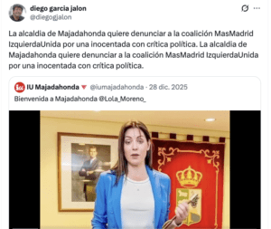 MANU RAMOS. (Majadahonda, 14 de enero de 2026). «La alcaldía de Majadahonda quiere denunciar a la coalición Más Madrid-Izquierda Unida por una inocentada con crítica política», ha denunciado este martes 13 de enero Diego García Jalón, catedrático del Departamento de Sistemas y Recursos Naturales de la Escuela de Montes, Forestales y Medio Natural de la Universidad Politécnica de Madrid (UPM). La «inocentada» consiste en un vídeo donde una voz metálica suplanta con humor a la alcaldesa para decir lo siguiente: «Estimados majariegos y majariegas, como he visto que los parques y jardines están quedando preciosos he decidido abandonar mi residencia en Leganés y venir a vivir a Majadahonda. A ver si de una vez me aprendo los nombres de los colegios públicos y los centros de salud, que me están costando un montón. Este sacrificio lo hago por los vecinos y vecinas que dicen que no tiene sentido que la alcaldesa de Majadahonda no viva aquí, ¡ya ves tu qué cosas!».