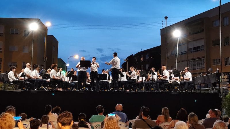 JULIA BACHILLER. La Banda Municipal de Música de Majadahonda, bajo la dirección de Miguel Fernández de la Peña, deleitó este sábado 21 de mayo (2022) a numerosos asistentes con un memorable concierto que tuvo lugar en la Plaza de Colón. El evento musical iba a dar comienzo a las 21:00 horas, pero debido a las inclemencias del tiempo retrasó su inicio media hora. La adversa climatología por suerte dio un respiro para que el público disfrutara del magnífico programa seleccionado para la ocasión con las bandas sonoras de famosas películas como The Lion King, Cinema Paradiso, Suite on Celtic Folk Songs, Hallelujah, The Star Wars EPIC, La La Land, y como broche final Guardianes de las Galaxias. La calidad de estos músicos de la Escuela Municipal Enrique Granados provocó numerosos aplausos, a pesar de la adversidad provocada por las rachas de viento, que en algunos momentos incluso hacían volar las partituras. Como bien anunciaba su director, “tras meses de ensayos y con mucha ilusión ponemos todo a punto para el concierto de esta tarde. Han sido más de 2 años de espera, pero ¡Por fin! Volvemos a tocar al aire libre para traer alegría a nuestras calles. ¡Que suene la música! ¡Y que nunca deje de hacernos soñar!”. Tan solo se registró una incidencia, y no tuvo que ver con el magnífico concierto sino a cauda de la falta de sensibilidad que mostraron algunos asistentes, espectadores o transeúntes, que o no valoraban o no sabían valorar con el suficiente respeto el trabajo y la ilusión de estos músicos, que durante años se preparan con esfuerzo para dar a conocer sus melodías.