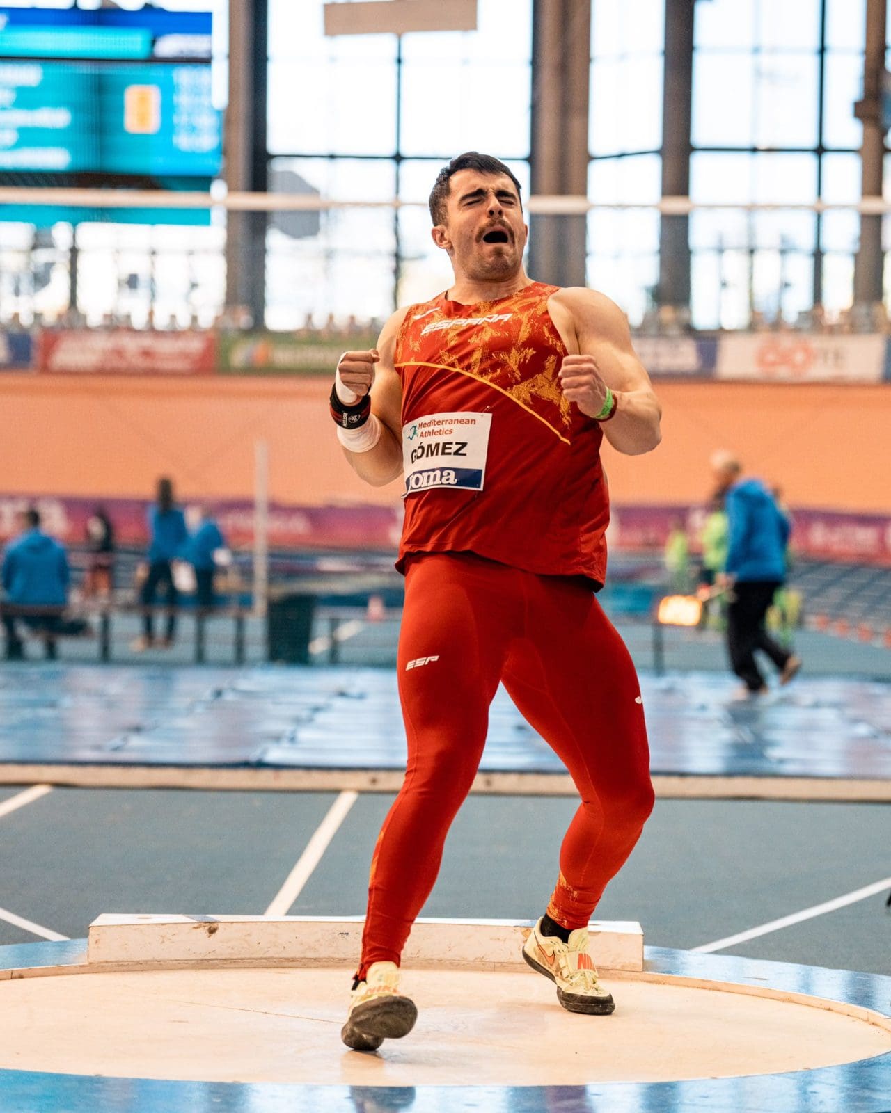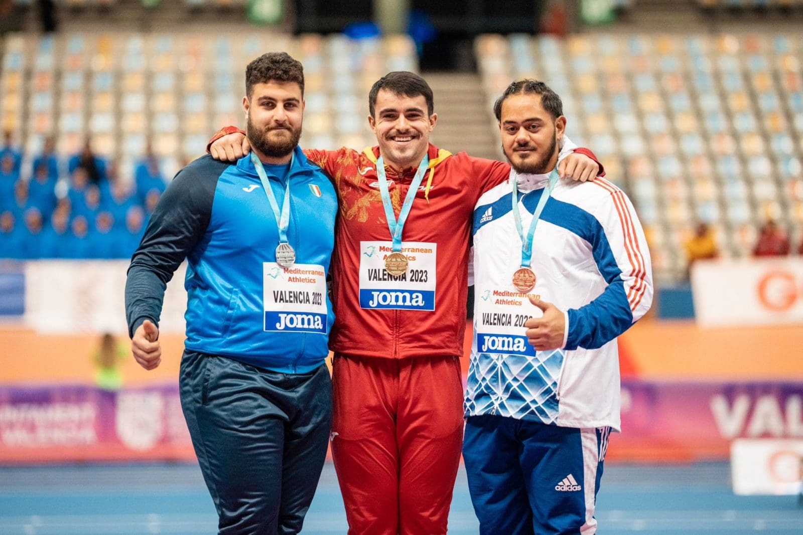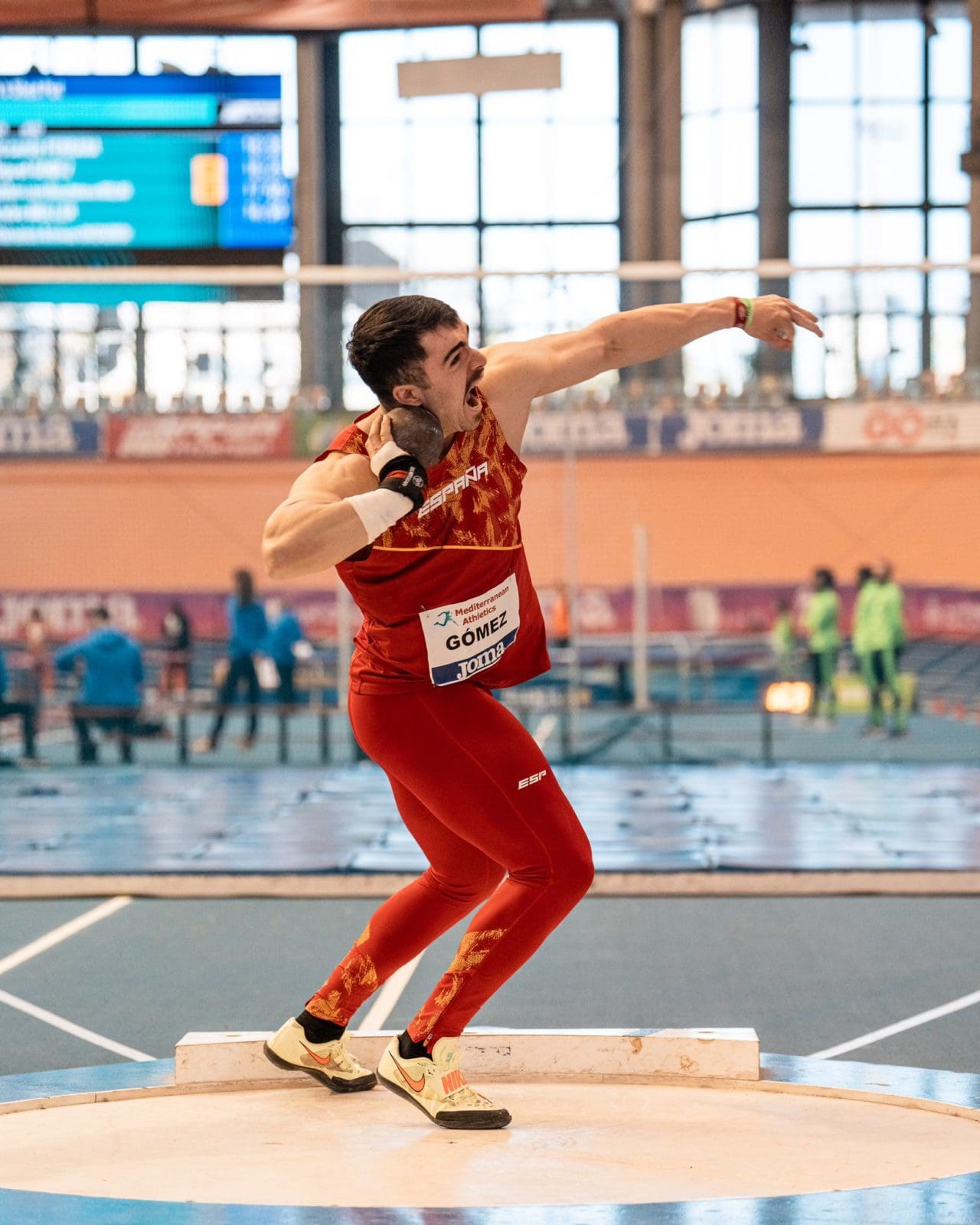 MANU RAMOS. El atleta del Club Atletismo Majadahonda, Miguel Gómez, conquistó la medalla de oro en lanzamiento de peso el domingo 22 de enero (2023) durante el Campeonato Mediterráneo Sub 23 de Pista Cubierta celebrado en Valencia con marca personal de 18,77 metros. La plata fue para Riccardo Ferrara de Italia con 18,75 metros y el Bronce para Mauotekena Mailagi de Francia con 17,96 metros. «La marca de Miguel es la tercera mejor marca española Sub 23 de la historia en Pista Cubierta y además supone un nuevo Récord del Campeonato. Con ella también batió su propio Récord de Madrid Absoluto«, declaró su entrenador, Jorge Gras. La selección española acudió con 25 atletas (14 mujeres y 11 hombres) que representaron al país en el coliseo valenciano y las crónicas deportivas mencionan al atleta mejariego.