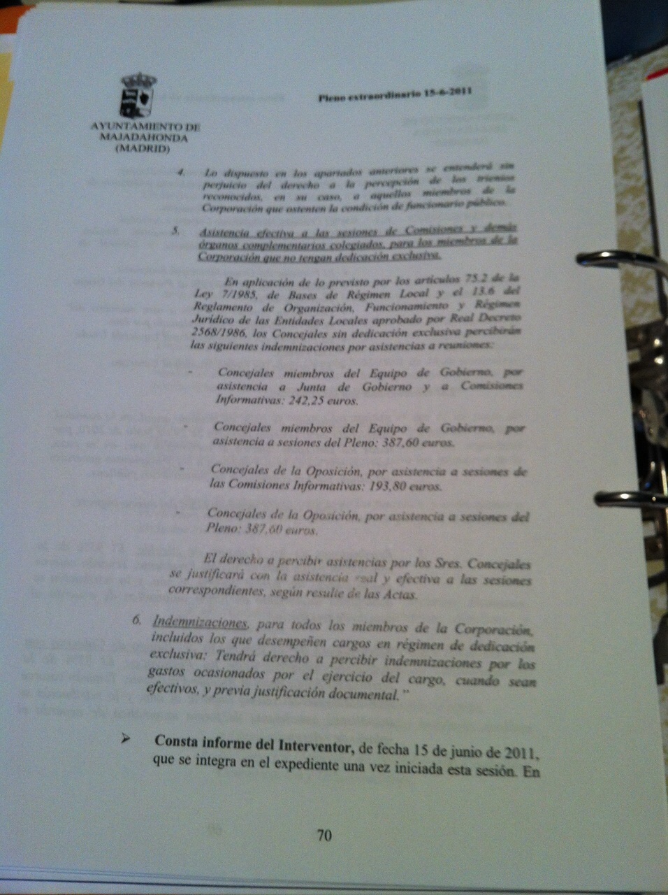 “Indemnizaciones”: todos los concejales “tienen derecho a percibir” lo que llaman “indemnizaciones” por “los gastos ocasionados por el ejercicio del cargo”. Esto significa que se les abonan gasolina, comidas, viajes “previa justificación documental”. Además tienen un teléfono móvil libre de gastos que paga el Consistorio.