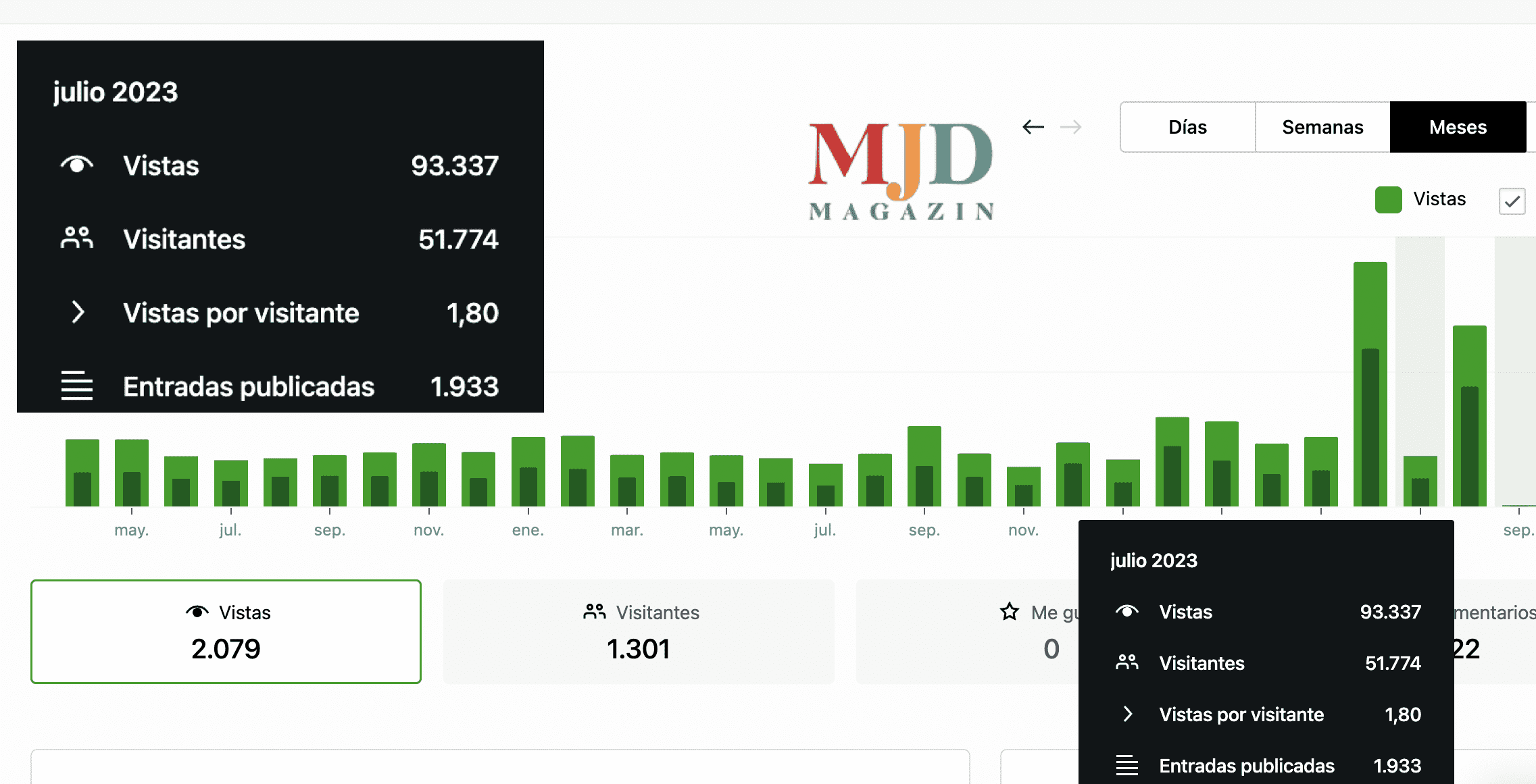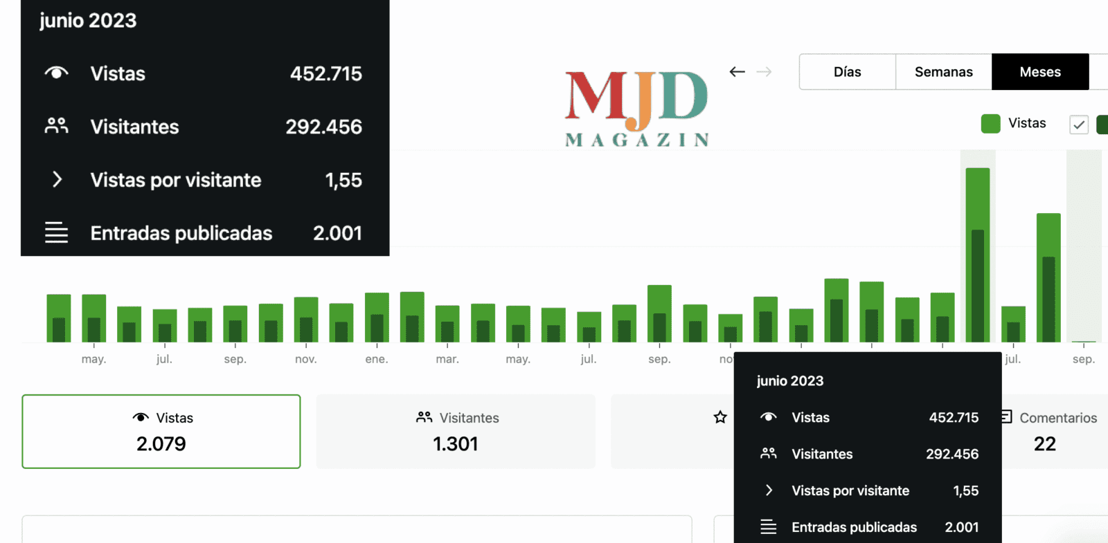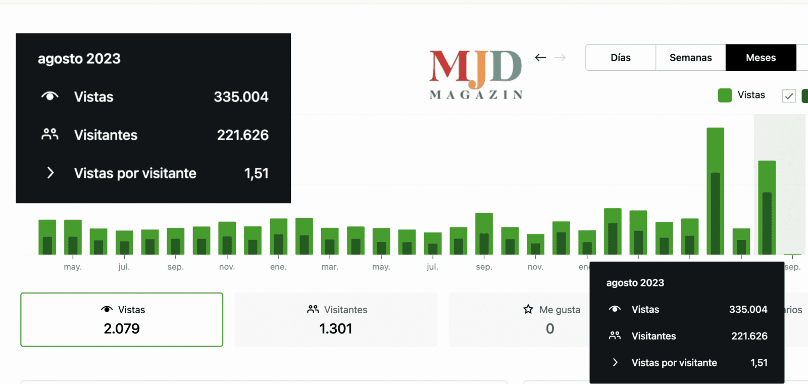 MANU RAMOS. La auditoría de audiencia de WordPress relativa al mes de agosto (2023) ha registrado unas cifras para MJD Magazin sorprendentes e impropias para un mes en el que tradicionalmente bajan las visitas: 335.000 entradas en la web tuvo este periódico, lo que hace que casi 11.000 personas la visitasen casa día, 77.000 a la semana. La pulverización de todos los registros que hasta ahora poseía este Magazin se debió sobre todo a 7 noticias que se pusieron por delante de la propia portada, que habitualmente es la página más vista. El hecho de que MJD Magazin se siguiera tanto este verano (el mes de junio fue aún más espectacular, con 425.000 visitas, más de 14.000 diarias) supone un nuevo respaldo de nuestros lectores y anunciantes, que han depositado mayoritariamente su confianza en este medio independiente que desde hace 8 años no falta ni un solo día a su cita con los lectores.