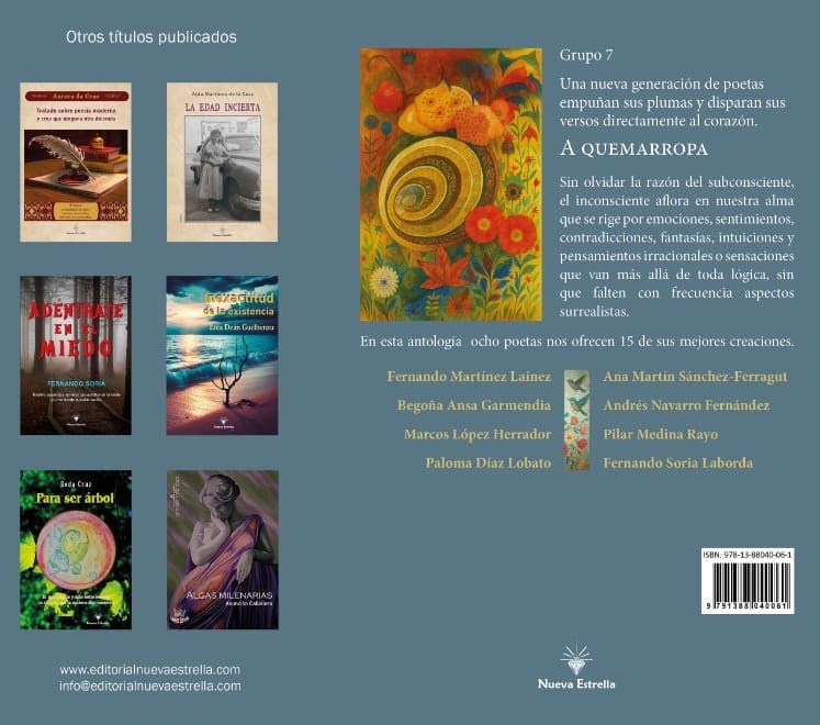 MARIANA BENITO. (Majadahonda, 3 de febrero de 2026). «Buenos días. Soy una poeta de este municipio que junto a otros siete poetas más de la zona oeste de Madrid hemos publicado una antología poética a la que nos gustaría dar difusión. Contacto con vosotros por si pudiérais ayudarnos a darnos a conocer. Muchas gracias». Con estas palabras, la poeta majariega Paloma Díaz Lobato escribió a la redacción de MJD Magazin para dar a conocer el poemario titulado «A Quemarropa» cuyos autores son el Grupo 7 y que ha sido publicado por la editorial Nueva Estrella en su primera edición de enero de 2026.