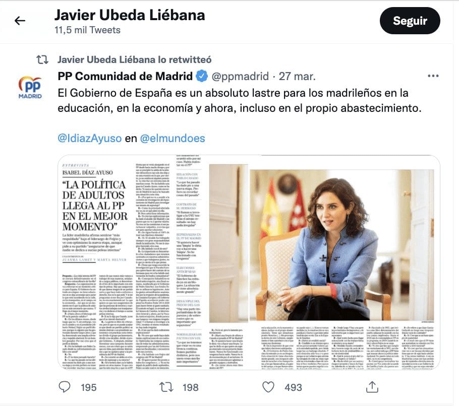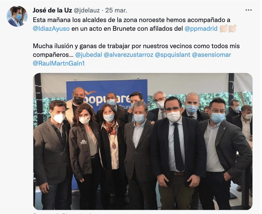 LA «DIVISION» DE LOS ALCALDES DEL PP. Esa «división de los alcaldes» a la que alude Ayuso se vio patente en el acto de Brunete. No solo las fotografías lo evidencian (unos se pegaron a Ayuso, otros simplemente se acercaron e incluso algunos se alejaron), sino también la «puesta en escena», relevancia y enfoque que los propios alcaldes le dieron al acto en sus cuentas personales. Javier Ubeda Liébana (Boadilla) intentaba aglutinar fuerzas «casadistas» y escribió: «Esta mañana acompañando a Isabel Díaz Ayuso en un encuentro con afiliados y con otros grandes alcaldes de la zona. Equipazo el que tiene PP Madrid en la Comunidad de Madrid y sus municipios». Fue casi lo mismo que hizo José de la Uz (Las Rozas): «esta mañana los alcaldes de la zona Oeste hemos acompañado a Isabel Díaz Ayuso en un acto en Brunete con afilados del PP Madrid. Mucha ilusión y ganas de trabajar por nuestros vecinos como todos mis compañeros…».
