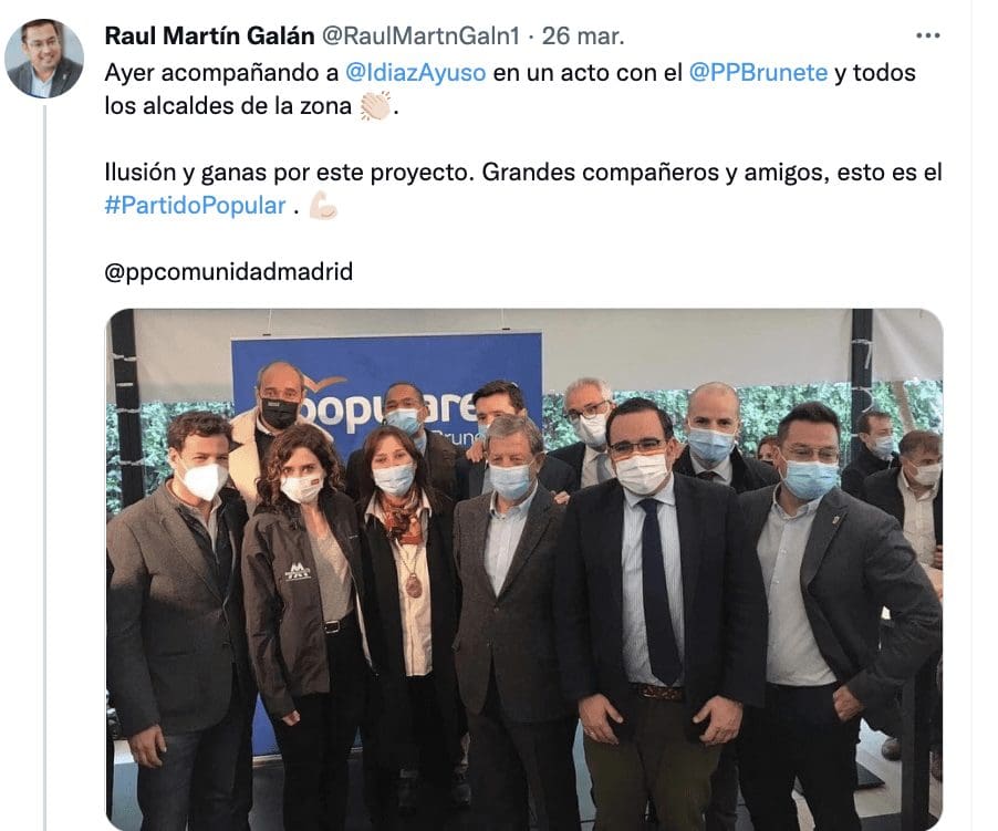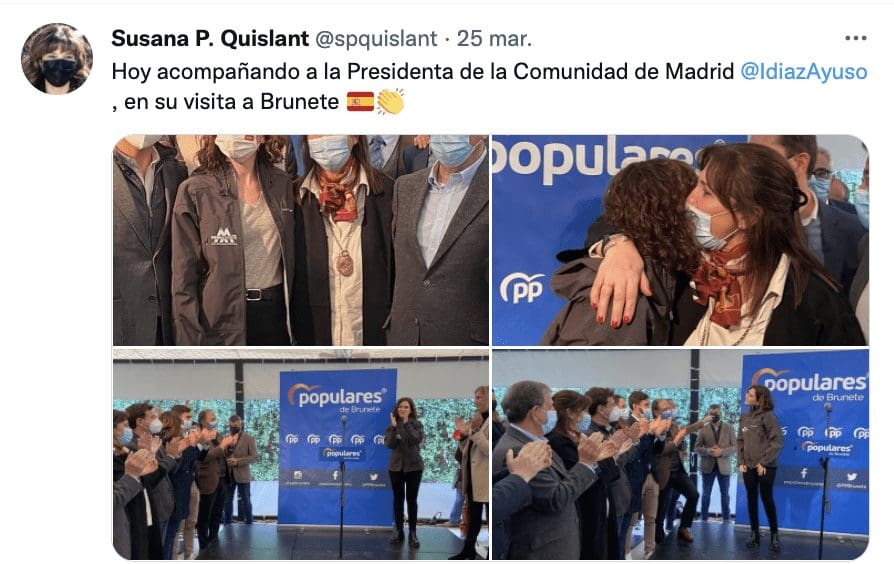 La alcaldesa Susana P. Quislant (Pozuelo) fue algo diferente, pues se alineó con la presidenta y prescindió de los alcaldes «casadistas» hasta hace muy poco: «Hoy, acompañando a la presidenta de la Comunidad de Madrid, Isabel Díaz Ayuso, en su visita a Brunete«. Y Raul Martín Galán (Villaviciosa de Odón), que lleva solo 1 año en la alcaldía tras ganar una moción de censura de PP-Vox, parecía desprender cierta euforia, quizás más vinculada a su nuevo cargo: «Ayer acompañando a Isabel Díaz Ayuso en un acto con el PP Brunete y todos los alcaldes de la zona. Ilusión y ganas por este proyecto. Grandes compañeros y amigos, esto es el Partido Popular». El alcalde de Majadahonda, José L. Alvarez, fue el único que no difundió ningún mensaje propio y se limitó a suscribir el de Boadilla. El acto de Ayuso según los alcaldes del PP: pinche en las siguientes imágenes para aumentar su tamaño: