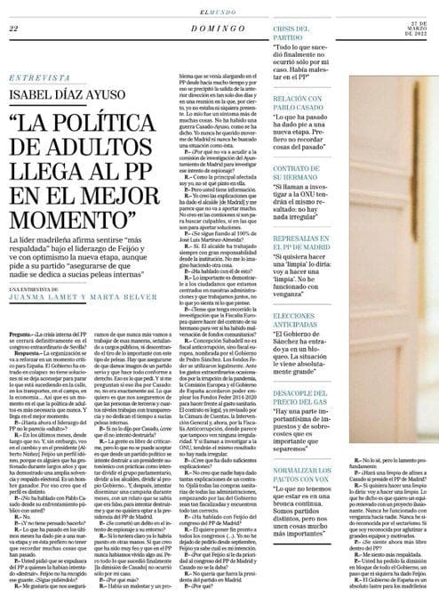 La entrevista, realizada por los periodistas Juanma Lamet y Marta Belver, es muy clarificadora para entender que está pasando en el PP de Madrid. «¿Hasta ahora el liderazgo del PP no le parecía adulto?«, le preguntan. Y Ayuso responde: «En los últimos meses desde luego que no», en una clara alusión al sector «casadista». Y añade: «Si quisiera hacer una «limpia» lo diría: «voy a hacer una limpia». La gente es libre de criticarme, pero lo que no se puede aceptar es que desde un partido político se intente destruir a un presidente autonómico con prácticas como intentar dividir el grupo parlamentario, dividir a los alcaldes, dividir al propio gobierno… Y después intentar diseminar una campaña durante meses, con un relato que se sabía que era falso, para intentar destruirme y que no quisiera optar a la presidencia del PP de Madrid«.