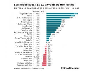 «Quitando obviamente Madrid capital, la ciudad más poblada de la comunidad que sufrió 5.462 robos (un descenso del 9,4%), el municipio más castigado ha sido el de Las Rozas (95.500 habitantes). Numéricamente hablando es el segundo con más asaltos, 366 (una subida del 38,1%), a pesar de que hay otras localidades con muchos más habitantes y un parque de viviendas más amplio. Otro municipio del oeste, Majadahonda (72.000 habitantes), encabeza el listado si contabilizamos el incremento de delitos. Es donde más crecieron, un 87%, hasta los 236 robos. Pozuelo de Alarcón (86.000 residentes) también está en los primeros puestos: 165 robos, una subida del 23%», relata «El Confidencial».