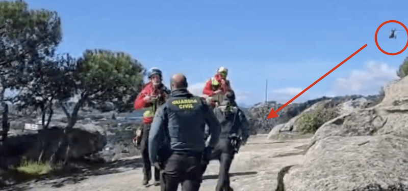 La imagen recoge el momento en el que el helicóptero que iba a trasladar a la senderista, los bomberos y la Guardia Civil rescatan a la herida