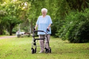 Paseando por Majadahonda: «Observo que sobre todo mujeres, también algún hombre, llevan ya sea el puño del bastón o los manillares del andador muy bajos, por lo que caminan con la espalda curvada hacia adelante, algo que a corto, medio o largo plazo va a ser causa de graves traumatismos. Sé de lo que hablo. Yo misma tengo cifosis y varias vértebras dorsales y lumbares “aplastadas”, es decir, con pérdida de tejido intervertebral». En la imagen, la postura correcta.