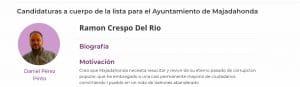 Motivación de Daniel Pérez Pinto: «Tras años de aguantar corrupción, empobrecimiento, deterioro de lo público a favor de lo privado, precarización del empleo, machismo asesino y degradante, desahucios injustificados, privatizaciones, maltrato animal y contaminación; tras mucho aguantar, necesitamos hacer las cosas para que la justicia social llegue por fin a la ciudadanía de Majadahonda. Es fundamental seguir los principios de Podemos para el cambio profundo en los municipios para 2019: transparencia, defensa de lo público, remunicipalización, etc. Los resultados obtenidos con las últimas negociaciones abren una nueva perspectiva para los de abajo, como la subida del salario mínimo interprofesional, porque la ciudadanía necesita otros municipios, tal y como Pablo Iglesias dice, contruidos para la gente, para la vida».