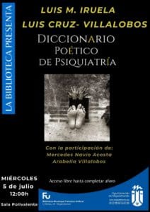 LIDIA GARCIA. «La Biblioteca Francisco Umbral del municipio de Majadahonda, en la Comunidad de Madrid, realiza este miércoles 5 de julio (2023) a las 12.00 horas de la mañana la presentación del libro «Diccionario poético de psiquiatría«, escrito por el psiquiatra y poeta español Luis M. Iruela, en comandita con el psicoterapeuta y prestigioso autor chileno Luis Cruz-Villalobos«, informa la web Cine y Literatura a través de la médico Julia Picazo Zappino, psiquiatra y doctora en medicina y cirugía por la Universidad Autónoma de Madrid. Julia Picazo realizó la especialidad de psiquiatría en el Hospital Universitario Puerta de Hierro de Majadahonda y cursó el máster en psicoterapia perspectiva integradora por la Universidad de Alcalá de Henares. Ha sido coordinadora médica de la Clínica López Ibor, y en la actualidad realiza su labor asistencial en la Unidad de Hospitalización Breve del Hospital Infanta Leonor de Madrid. Es autora del libro «El suicidio actual», publicado por la editorial EOS Psicología.