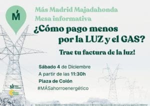 Más Madrid realiza en Majadahonda una asesoría energética. Ante el aumento continuo del precio de la energía y el incremento de las facturas de consumo eléctrico en los hogares, Más Madrid Majadahonda salió a la calle este mes de diciembre (2021) «para dar a conocer a la ciudadanía las medidas Más eficaces de Ahorro en casa». En una nota de prensa añade que «somos conscientes del impacto del precio de la luz en la economía doméstica. Estamos ante un largo invierno en el que la recuperación económica no acaba de llegar y la pobreza energética es una realidad que afecta a mucha gente, incluso en nuestros entornos más cercanos. La solución al problema del precio de la energía parece lejano, sin embargo desde Más Madrid hemos diseñado un pequeño manual de asesoría energética destinado a que todo y todas podamos ahorrar en nuestro consumo diario sin tener que renunciar al uso de la calefacción o de nuestros electrodomésticos». La formación política, que tan buenos resultados alcanzó en Majadahonda en las últimas elecciones autonómicas (4.000 votos) convocó «a los vecinos y vecinas de Majadahonda en la Plaza de Colón para estudiar cada caso, explicar la complicada factura de la luz y aconsejar en materia de ahorro energético».
