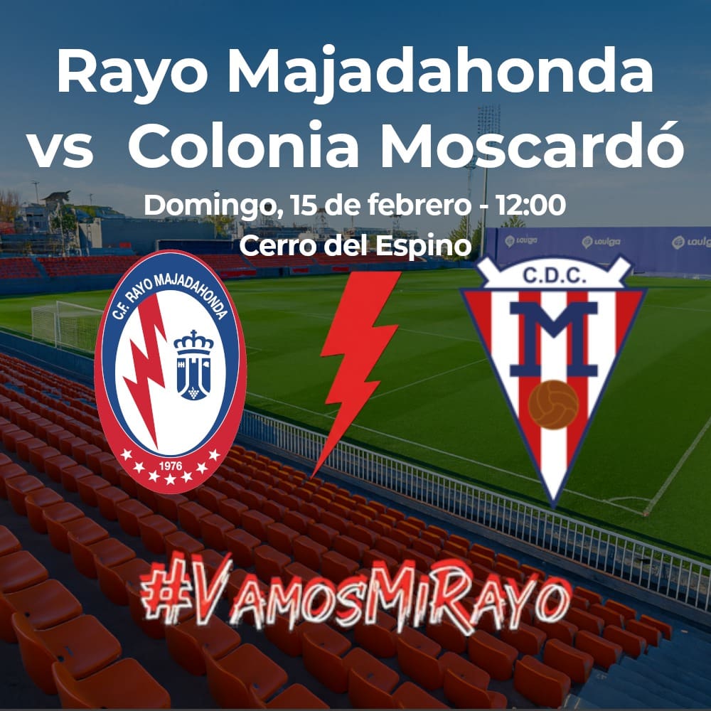 ALBERTO PAZOS (Majadahonda, 13 de febrero de 2026). El CF Rayo Majadahonda recibe este domingo 15 de febrero a las 12,00 de la mañana en el Cerro del Espino al Club Deportivo Colonia Moscardó, club que llega 17º en la tabla, penúltimo clasificado, pero que ganó el fin de semana pasada al Fuenlabrada por un contundente 3-0. Es el mismo resultado que cosechó el Rayo Majadahonda en su visita a Valdebebas, en un partido en el que seguramente no será recordado como el de mayor dominio en cuanto a juego del Rayito, pero al que favoreció una expulsión de Alfredo Sotres, central del Real Madrid C en el minuto 35, que pudo facilitar que los rayistas aplastaran al conjunto madridista en la segunda parte, con goles de Calçada, Fran Pérez y Carmona.
