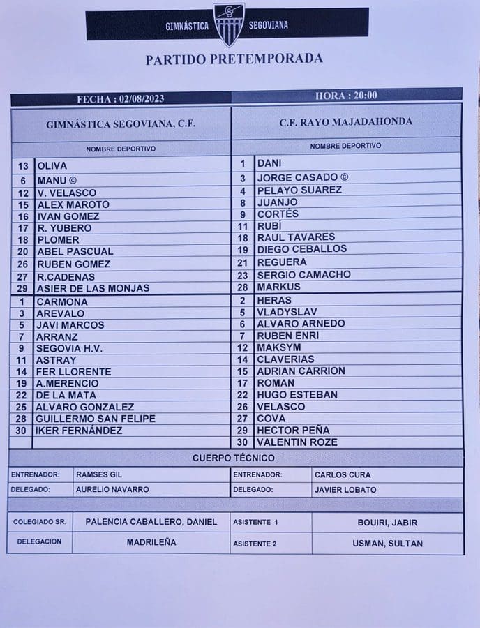FICHA DEL PARTIDO. Gimnástica Segoviana CF: Alineación primera parte: Oliva, Manu, Velasco, Álex Maroto, Iván Gómez, Yubero, Plomer, Abel Pascual, Rubén Gómez, Cadenas, Asier de las Monjas. Segunda parte: Carmona, Arévalo, Javi Marcos, Arranz, Segovia H.V., Astray, Fer Llorente, Merencio, de la Mata, Álvaro González, Guillermo San Felipe, Iker Fernández. Entrenador: Ramsés Gil. CF Rayo Majadahonda: Alineación primera parte: Dani Martín, Jorge Casado, Pelayo Suárez, Diego Ceballos, Juanjo, Raúl Tavares, Reguera, Sergio Camacho, Cortés, Rubí, Markus. Segunda parte: Heras, Vladyslav, Álvaro Arnedo, Rubén Enri, Maksym, Claverías, Adrián Carrión, Román, Hugo Esteban, Velasco, Cova, Héctor Peña, Valentin Roze. Cambios: sale Jorge Casado y entra Cova; sale Reguera y entra Cova; entran Álvaro Arnedo, Hugo Esteban, Vladyslav. Entrenador: Carlos Cura. Goles: Cortés (min 44 y min 57 y Carrión, minuto 89 (Rayo Majadahonda). Tarjetas: amarillas (min 64: Velasco, Gimnástica Segoviana), Maksym (min 73, Rayo Majadahonda). Árbitros: Daniel Palencia Caballero. Asistente 1: Jabir Bouiri. Asistente 2: Sultan Usman. Incidencias: ninguna. Más fotografías del partido (pinche sobre la imagen para aumentar su. tamaño):