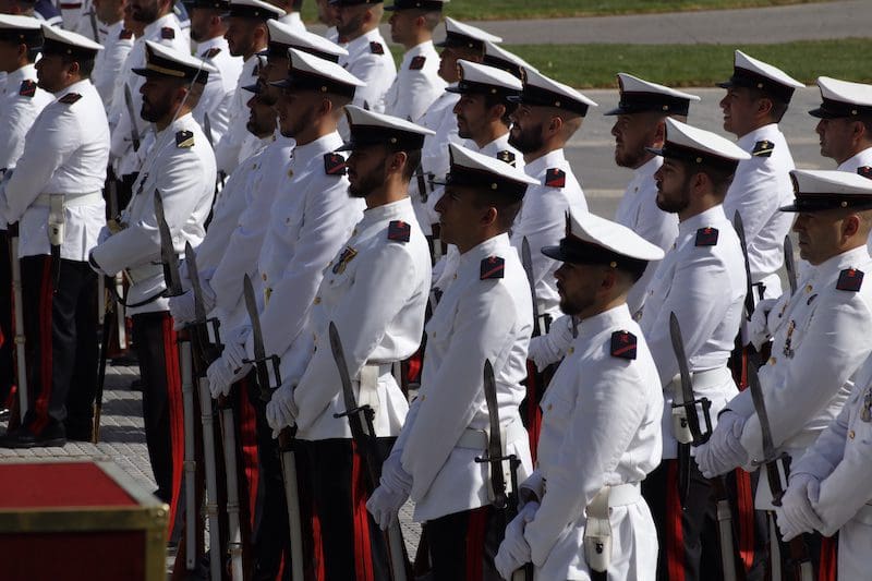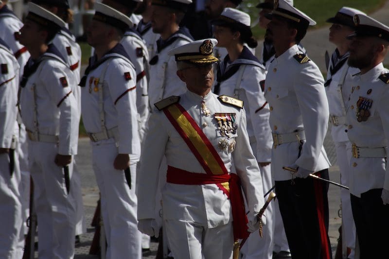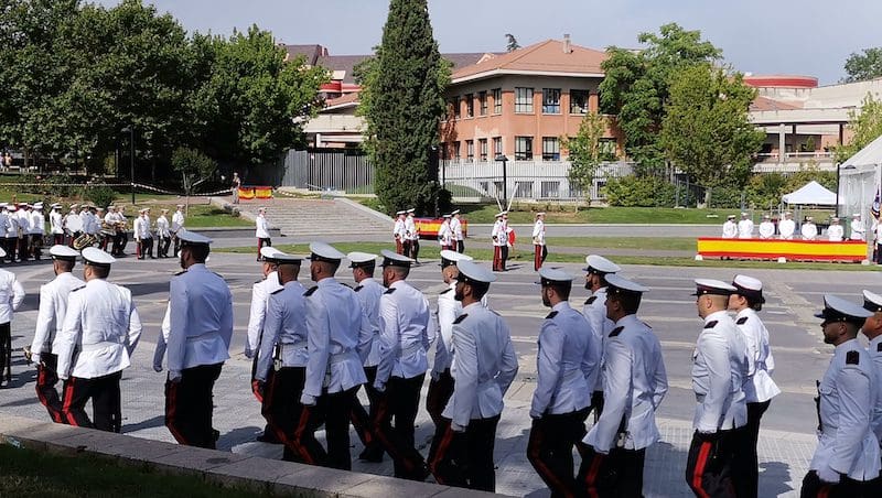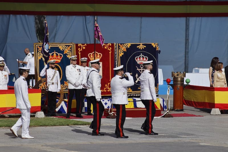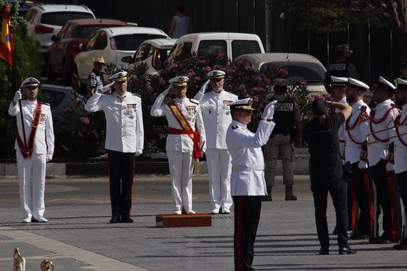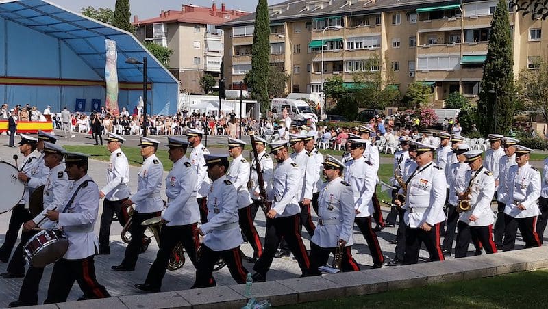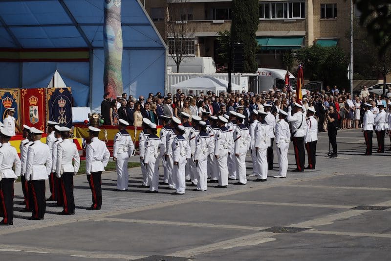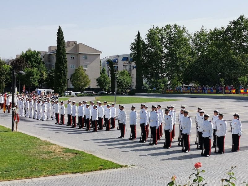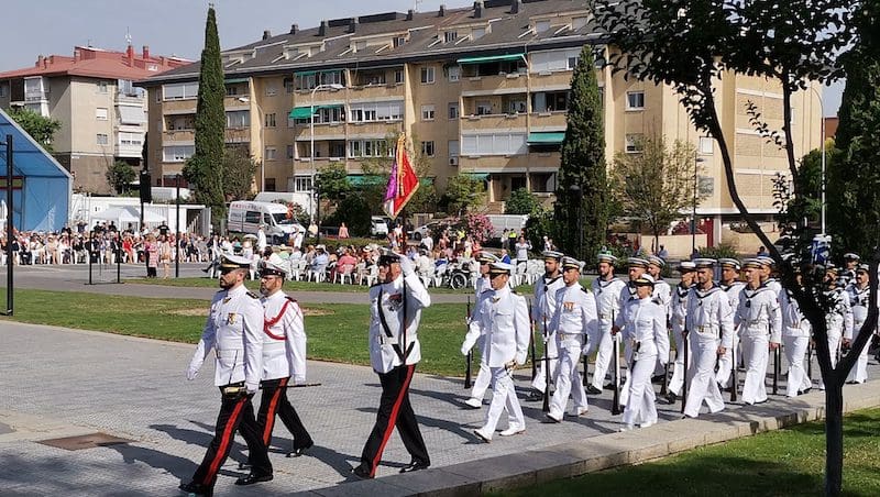 J. BACHILLER/J. MARUGÁN (fotos). La primera Jura de Bandera destinada a la sociedad civil de Majadahonda tuvo lugar este sábado 18 de junio (2022) a las 10:30 horas organizada por la Armada (Ministerio de Defensa) y promovida por el Ayuntamiento de la ciudad. El acto fue presidido por el Almirante Jefe de Servicios Generales y Asistencia Técnica de la Armada, Rafael Fernández-Pintado Muñoz–Rojas. La compañía de honores estuvo encabezada por la Escuadra de Gastadores y la Unidad de Música pertenecientes a la Agrupación de Infantería de Marina de Madrid, única unidad perteneciente a la flota cuya base no se encuentra en la costa. La Unidad de Música es la de mayor entidad de la Armada, por tener que representar a esta en la mayoría de los actos militares de carácter institucional que tienen lugar en la capital de España. Junto a estos, participó una compañía mixta de honores formada por dos secciones de Infantería de Marina, pertenecientes a la Agrupación de Infantería de Marina de Madrid, y una sección de Marinería perteneciente al Cuartel General de la Armada. El acto dio comienzo con la llegada del Almirante, quien fue recibido por el Coronel Comandante de la Agrupación de Infantería de Marina de Madrid. Tras rendirle los honores de ordenanza, a continuación pasó revista y seguidamente efectuó su llegada el alcalde de Majadahonda. Una vez situados en sus lugares correspondientes y siguiendo el protocolo de este tipo de acto, se procedió a dar lectura al juramento ante la bandera: “Españoles, ¿juráis o prometéis por vuestra conciencia y honor defender la Constitución como norma fundamental del Estado, con lealtad al Rey, y entregar, si preciso fuera, vuestra vida en defensa de España?”. Tras ese momento se escuchó al unísono la voz de los civiles, unos prometiendo y otros jurando, según decisión propia. Seguidamente los protagonistas pasaron en fila ante la bandera haciendo una reverencia ante ella.