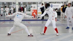 Foto de Antonio Hernández (El Correo Gallego) con dos espadistas en el Open Compos celebrado en el pabellón santiagués de Pontepedriña