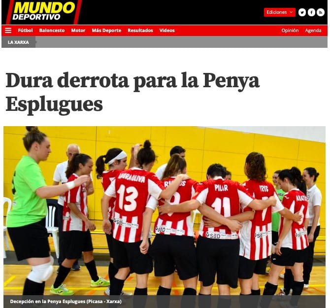 Mundo Deportivo: «El equipo del Baix Llobregat perdió por la mínima (1-2) contra el Majadahonda en la jornada 25 de la máxima categoría del fútbol sala femenino. Las jugadoras de Cinto Garcia, muy desacertadas en los metros finales, dejaron escapar los tres puntos en Les Moreres en un partido irregular que llegó al descanso con empate (1-1). En la segunda mitad, las locales no pudieron con el muro defensivo de las madrileñas pese a disponer de buenas ocasiones. El otro equipo catalán de la liga, el Femisport Palau, cayó en la pista del Viaxes Amarelle (7-1)». La crónica de Gustavo Voces resume el encuentro disputado en Primera División de la siguiente manera:
