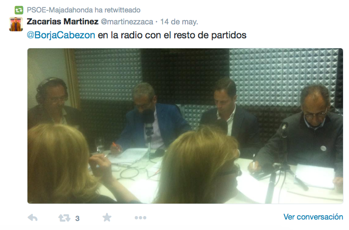 El PSOE de Majadahonda salió de nuevo este fin de semana a las calles de Majadahonda para instalar su carpa electoral y repartir su oferta programática, que también está distribuyendo a través de sus redes sociales. El portavoz y candidato a la alcaldía, Borja Cabezón, prepara para la última semana de campaña que comienza este lunes una «sorpresa» en forma de acto electoral, de la que no quiso dar excesivos detalles. Por su parte, el número 2 del PSOE, Zacarías Martínez Maíllo, acompañó a Borja Cabezón al debate celebrado en Radio 3w.com y retuiteó los momentos más estelares de la intervención de su candidato.
