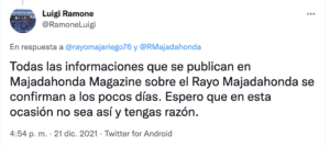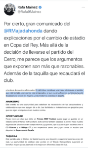 Álvaro (@SRTej8): «Para la gente que se está quejando. Obvio que es mejor que se juegue en el Cerro y es lo que queremos casi todos. Llevamos dos años que la economía está fatal un año, se ha cancelado una temporada y otra solo íbamos menos de 500 personas por partido. Obviamente un club pequeño como el Rayo Majadahonda no puede rechazar algo así. El único problema que veo es que no usen el dinero para cosas útiles como un techo en el Cerro (por poner un ejemplo). Además el otro día salió que un club de Primera RFEF (solo) puede ganar 300.000 € en una temporada. No sé cuanto dinero sacará el Rayo Majadahonda, pero dale que las entradas salen a 40 euros (el año pasado las entradas del Yeclano vs Valencia costaban eso). El Wanda tiene 68.456 y dale que van 30.000. Si cada entrada cuesta 40 euros, se estarían ganando 1.200.000 de euros. De esta cantidad no sé cuanto se llevarían, pero si se llevan la mitad, ya están ganando en un partido más que lo que pueden ganar en un año. Y no hay que olvidar que al final esto es un negocio y oportunidades así no se pueden rechazar. Dicho esto, obviamente que fastidia que no se juegue en el Cerro. Pero solo queda apoyar al Rayo. ¡Forza Rayo!».